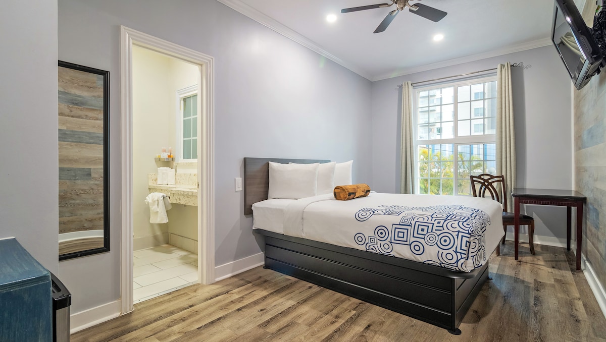 Oferujemy nowo wyremontowane, nowoczesne pokoje zaprojektowane z idealnym połączeniem wygody i wygody w naszym motelu butikowym. To stylowe miejsce jest centralnym punktem obowiązkowych miejsc, takich jak stadion SoFi, Disneyland i Universal Studios. Bezpłatnie: Wi-Fi, telewizja kablowa, parking, mikrofalówka, ekspres do kawy, media all-inclusive, przyjazna i profesjonalna obsługa recepcji, całodobowa ochrona. Ten pokój ma duże łóżko, które wygodnie pomieści 2 osoby dorosłe i 1 dziecko. Bez depozytu. Zameldowanie 24/7.