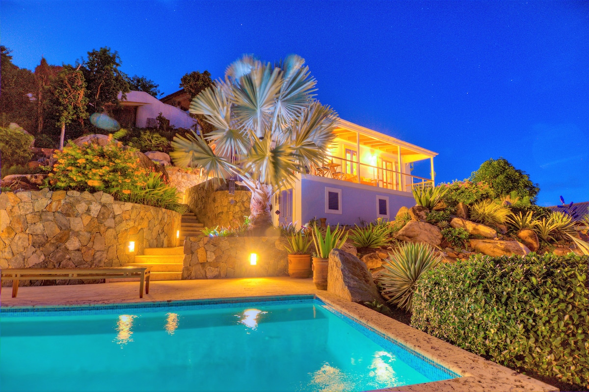 Tropikalny dom z 2 sypialniami i 2 łazienkami zasilany energią słoneczną; letnia oferta specjalna! 20% zniżki! Idealne miejsce do pracy zdalnej, na miesiąc miodowy i dla poszukiwaczy przygód z oszałamiającym widokiem. Latem jest tu chłodniej niż w Stanach! Loft queen bedroom and open air queen bedroom en suite. Rozległy otwarty taras z hamakiem, krąg medytacyjny z kamieni naturalnych. Prywatne, romantyczne, odosobnione miejsce na połowie akra lasu tropikalnego na granicy Parku Narodowego Wysp Dziewiczych. Wymaga pojazdu z napędem na cztery koła i ducha przygody! W pobliżu barów, restauracji i sklepów w Coral Bay