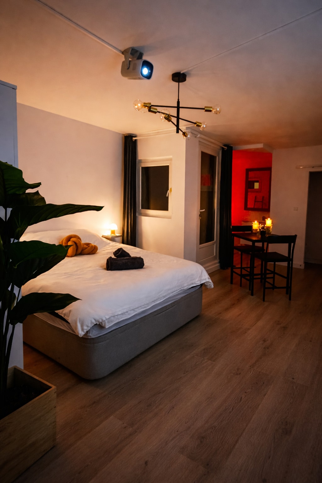 Odkryj nasz romantyczny apartament, idealny na niezapomniany romantyczny wypad! Udogodnienia z górnej półki: - Gorąca wanna 70 dysz - Średnie łóżko (queen) - Ręczniki i produkty do kąpieli wliczone w cenę - Projektor ekranowy olbrzymi: Netflix, Prime, Disney+ projektor: Netflix, Prime, Disney - Gwiaździste niebo i lekkie gry dla romantycznej atmosfery - Aneks kuchenny z ekspresem do kawy Nespresso i czajnikiem - Restauracje w pobliżu, w których można gotować.