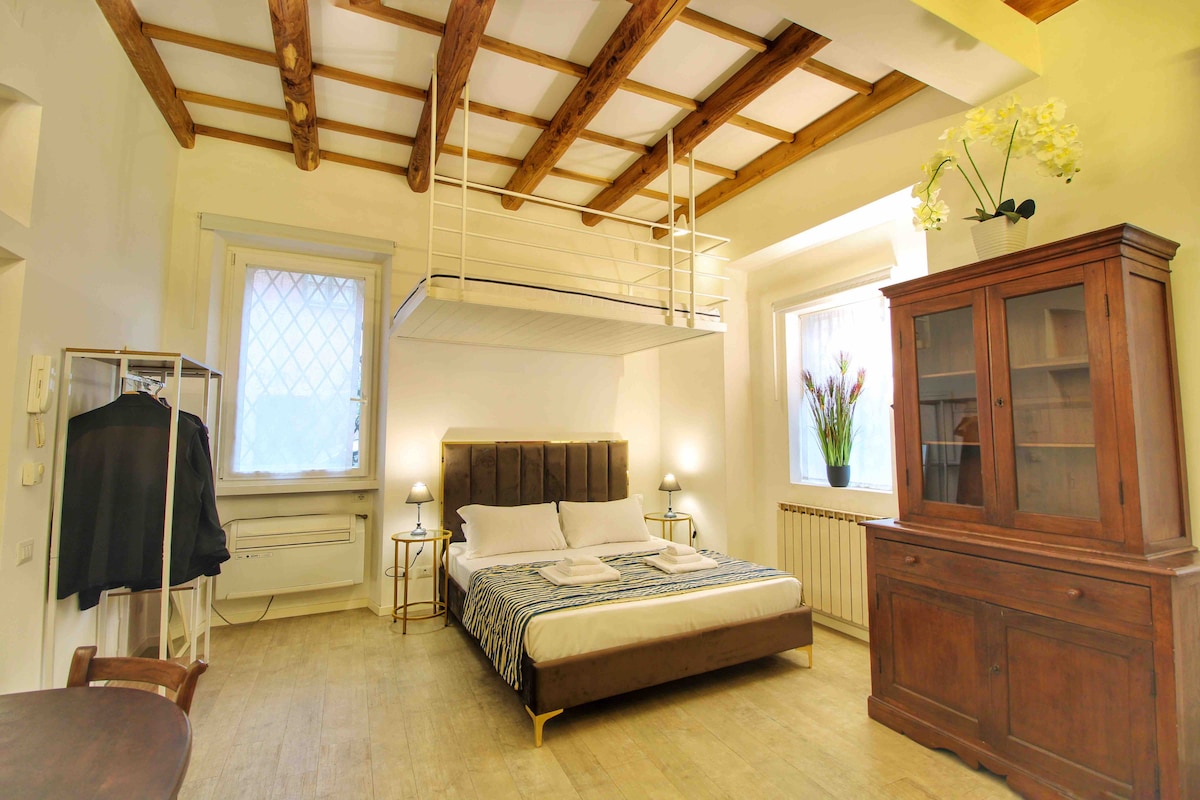 Apartament designerski położony na 3. piętrze zabytkowego budynku w dzielnicy Trastevere. Apartament posiada 1 sypialnię, 1 łazienkę z kabiną prysznicową, przestronny salon i kuchnię z wyspą wyposażoną w piekarnik i zmywarkę. Widok na Tyber z widokiem na Wiktorianum. Bardzo dobrze skomunikowany z całym miastem, jest idealnym miejscem do zwiedzania pobliskiego Piazza Venezia, Koloseum, Forów Rzymskich, Wyspy Tyberyjskiej, Bocca della Verità, Kapitolu, Getta Żydowskiego i do podziwiania charakterystycznej rzymskiej dzielnicy.