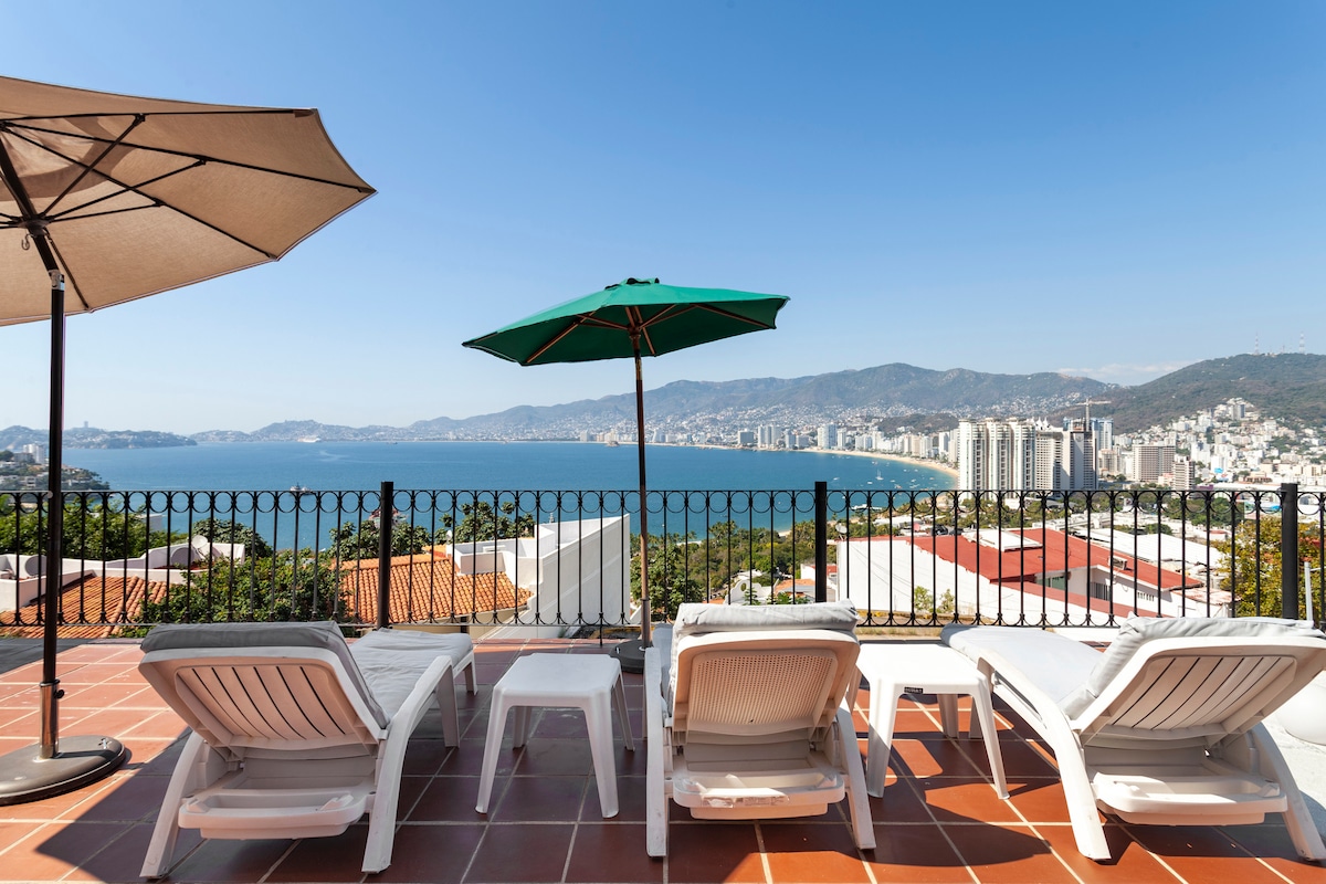Pent House PET Friendly único en Acapulco con una vista a 360 grados. Alberca panorámica que permite gozar del show de los clavadistas de la Quebrada. Area de sala y comedor totalmente abierta hacia el exterior con terraza amplia. Cocina equipada y tres recamaras cómodas cada una con su respectivo baño. La decoración del PH es de estilo mediterráneo. El espacio goza de la ventilación natural de la brisa marina lo cual da una sensación de bien estar.