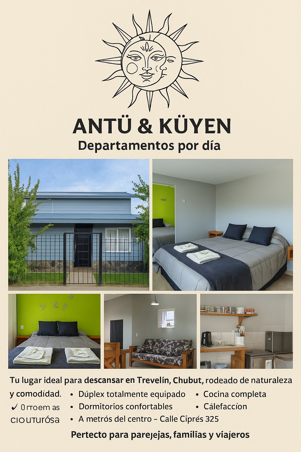 Chatki z 2 sypialniami na jednym poziomie. Pokojówka i pościel, telewizja kablowa i WiFi. Kuchnia wyposażona w jadalnię i salon. Mamy quincho do użytku naszych gości i park z zabawami dla dzieci. Parking jest odkryty wewnątrz nieruchomości. Jesteśmy 6 przecznic od wejścia do Esquel i 16 przecznic od centrum handlowego. Śniadanie jest opcjonalne, za dodatkową opłatą.