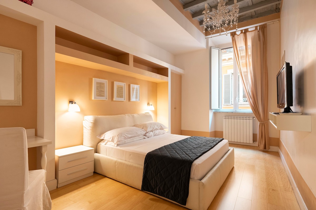 Bardzo przestronny apartament składający się z przedpokoju, jadalni z aneksem kuchennym i kącikiem śniadaniowym, dwóch głównych sypialni z łazienką oraz wygodnych sof do relaksu. Apartament znajduje się bardzo blisko Schodów Hiszpańskich i jest dobrze położonym miejscem do zwiedzania pieszo zabytków miasta, w tym Fontanny Trevi, Koloseum i Forum Romanum; idealny również do korzystania z najbardziej ekskluzywnych ulic handlowych: Via dei Condotti, Via Frattina, Via del Corso, La Rinascente i wielu innych.