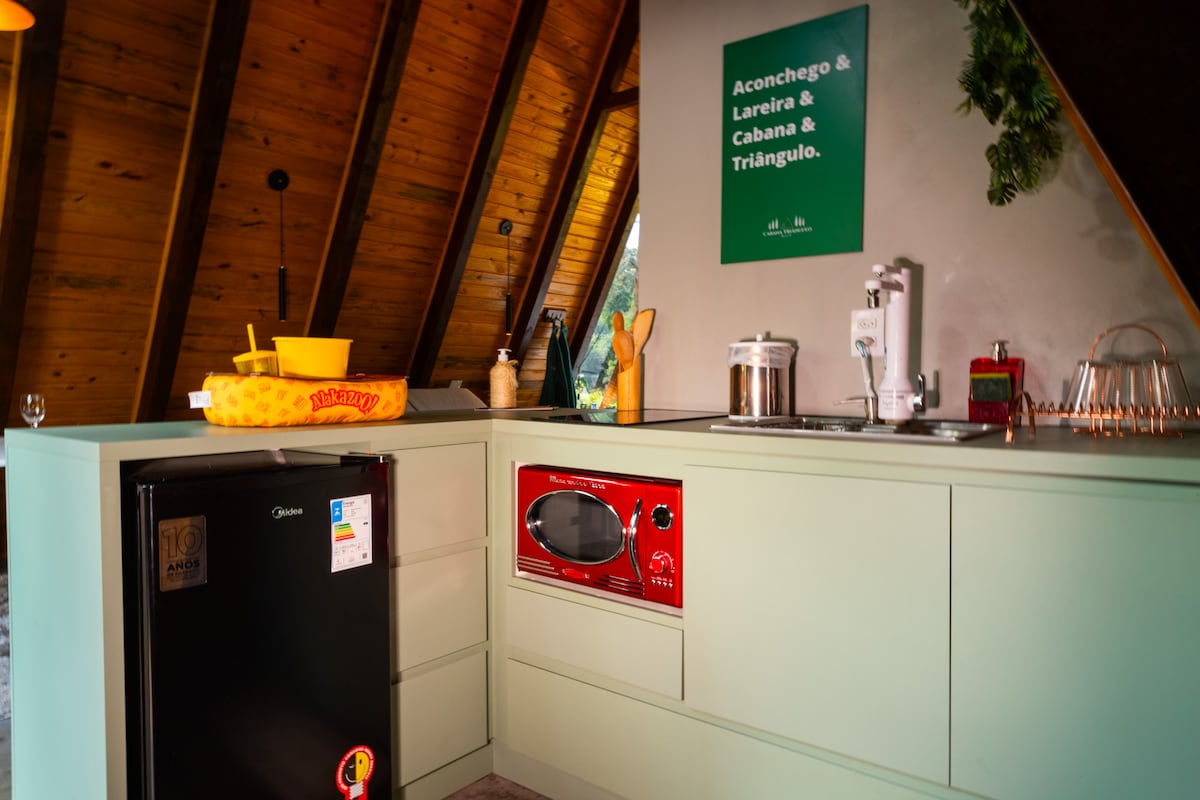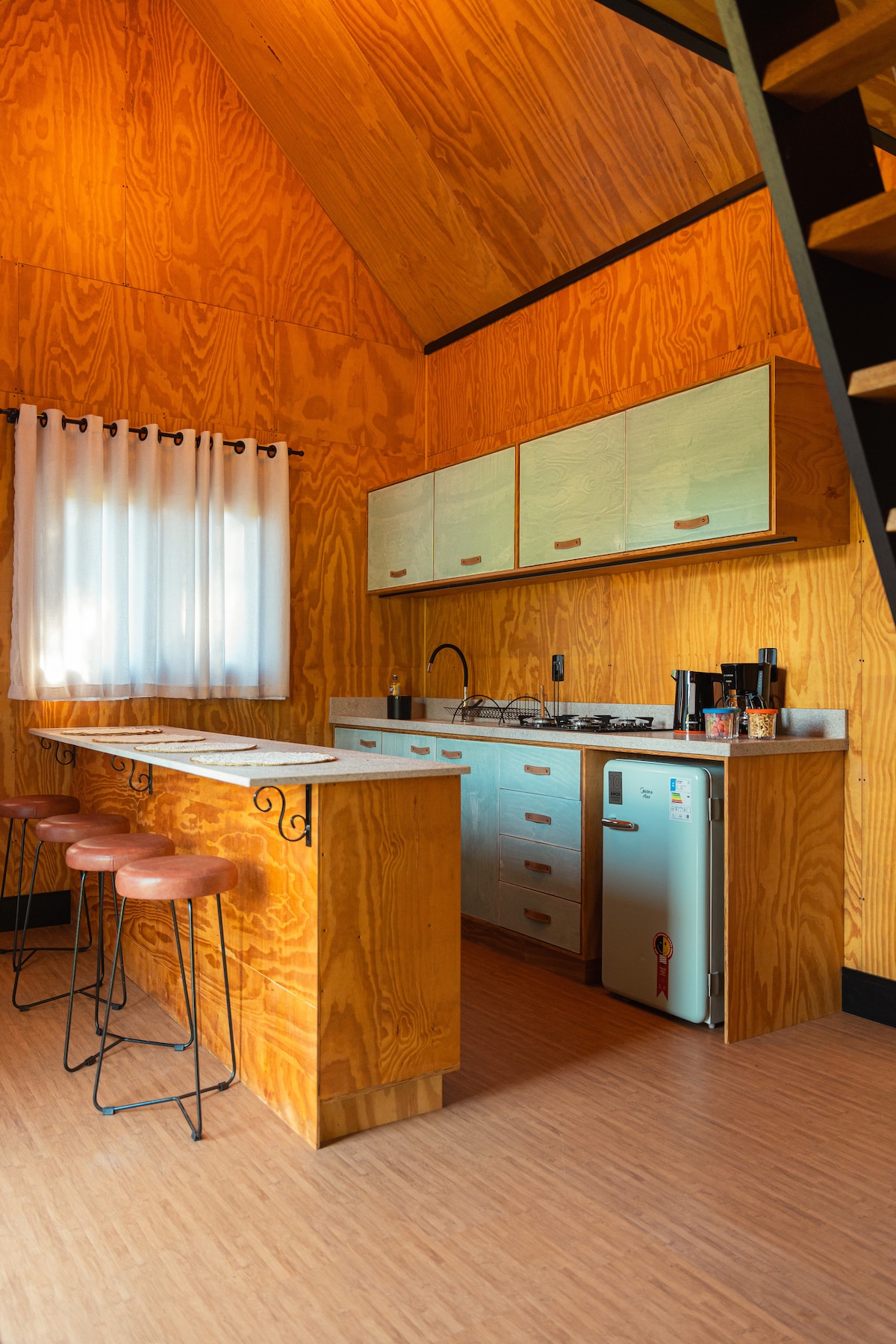 Cabana 100% privativa/ individual. Área externa compartilhada com outra cabana e nossa família ( piscina e jardim). Possui cozinha completa, geladeira com freezer, fogao a gás, micro-ondas, chaleira elétrica, cafeteira italiana, pó de café, acucar e sal sao cortesias. A cozinha possui todos os utensílios. São 2 quartos, o superior com cama King size e TV. O de baixo com cama de casal. Sala e um banheiro. Piscina, jardim externo, horta churrasqueira portátil. Colchões extras.