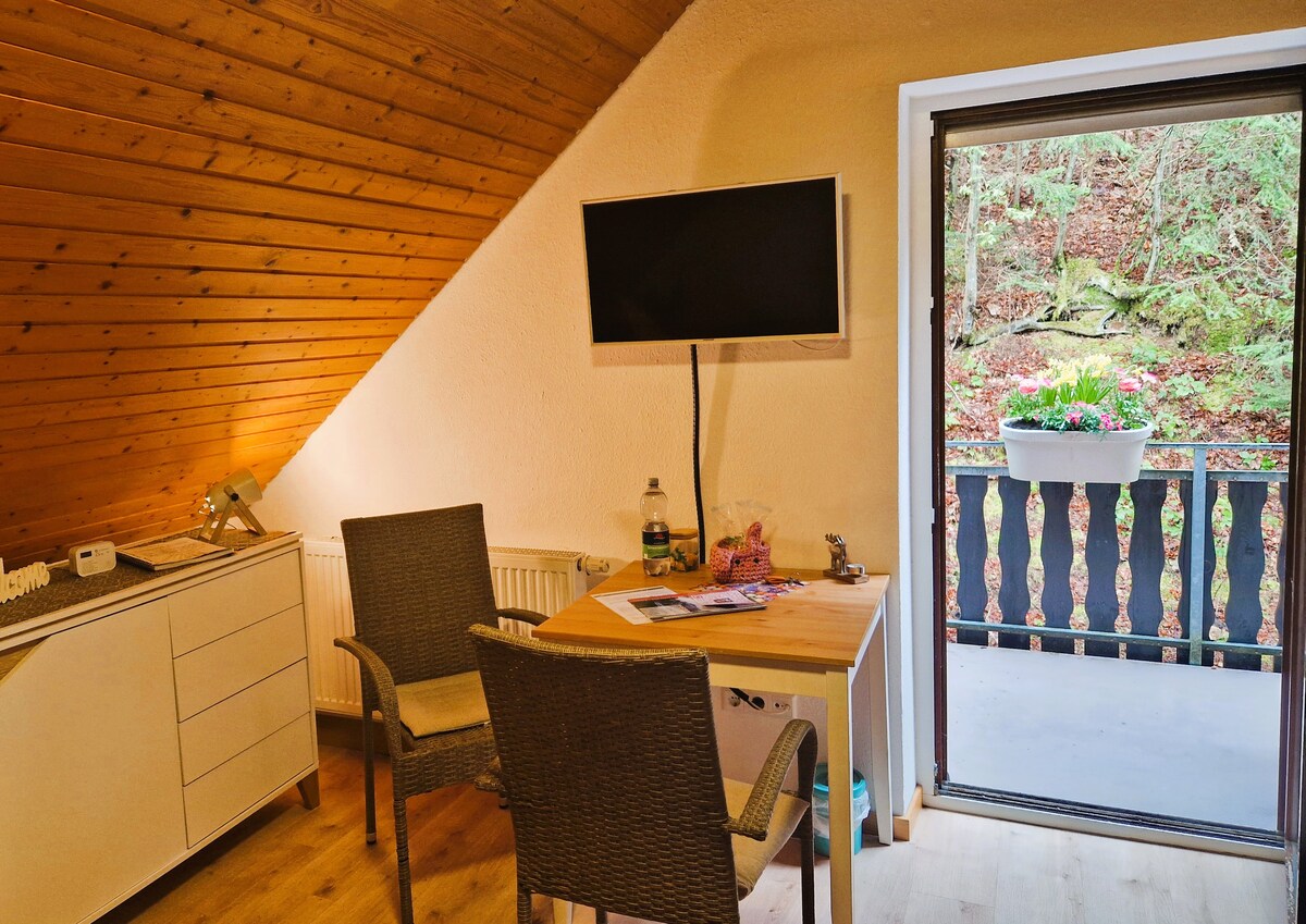 Miejsce dla osób szukających spokoju, natury i relaksu. Ten kompaktowy apartament o powierzchni 22 m² z przytulną atmosferą „jak w gnieździe” znajduje się na skraju lasu. Jest w nim przestronny balkon, wanna, szybkie Wi-Fi i wszystko jest pięknie umeblowane. Idealne dla par lub podróżujących w pojedynkę, którzy chcą doświadczyć Schwarzwaldu w relaksującej atmosferze. Szlaki turystyczne zaczynają się tuż za drzwiami. Wodospady Triberg, basen na świeżym powietrzu i centrum miasta znajdują się w odległości krótkiego spaceru.