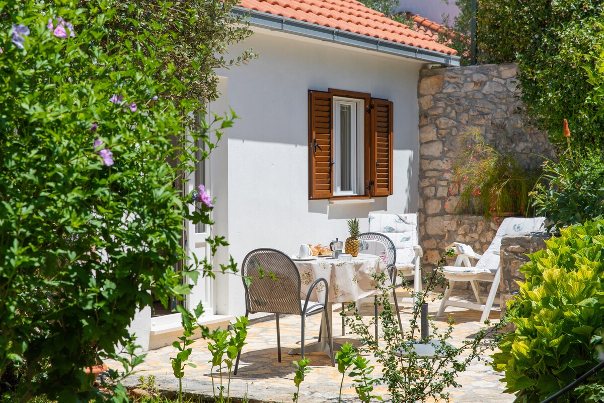 Charming petite house, with beautiful garden, ideal for meals under the stars. Great view at the city of Trogir and the sea. One bedroom, kitchen, living room, bathroom, five minutes easy walk from Old town and 8 minutes by foot from the beach.