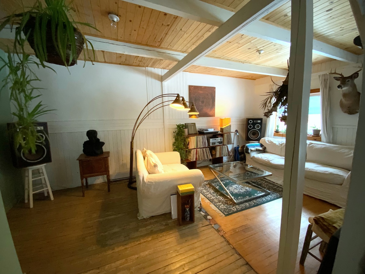 À 1h30 de Mtl. Sortez de votre routine, pour décrocher l'espace d'un week-end. Partez à la découverte d'un coin de pays méconnu et ce, à peu de frais! En pleine campagne, dans le bâtiment secondaire, ce loft distinctif avec vue sur atelier d'artiste vous charmera par son coté éclectique. WiFi et internet inclus. Empruntez plusieurs trajets (vélo ou voiture) loin des circuits traditionnels. Venez piquer une jasette avec nos maraîchers, pêcheurs, artistes et artisans locaux. CITQ 301214