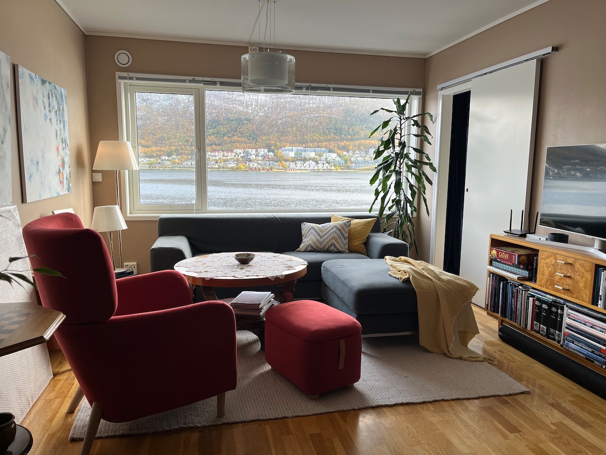 Downtown apartment on the water's edge. 14 minutes walk to the core of the city's restaurants and shopping center. Apartament jest ciepły i wygodny, z widokiem na ocean, górską windę i most Tromsø. Dobre połączenia autobusowe i sklepy spożywcze w pobliżu. Kuchnia ma wszystko, czego potrzebujesz, aby przygotować i cieszyć się posiłkami w domu. Łóżka i ręczniki. Dwie szafy. Tutaj możesz się zrelaksować, a jednocześnie podziwiać widok na krajobraz, kiedy nie zwiedzasz ekscytującego Arktycznego Tromsø.
