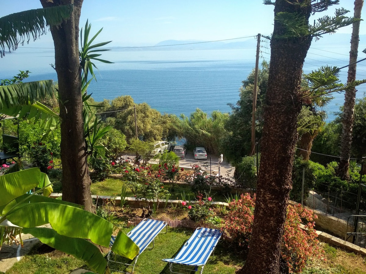 The apartment located in a quiet neighborhood in the traditional seaside village of Benitses is 12km south of Corfu and ca.60m from the beach.Offers immediate access to a variety of local restaurants,gift shops,mini markets.The bus stop leading to Corfu Town is only 50m away.It offers private parking as well as a nice view of the mountain;has a lovely vine shaded yard and a kitchn fully equipped with cooking facilities,cookware,fridge,washing machine,A/C,vacuum cleaner,hair dryer,iron.Smoke free