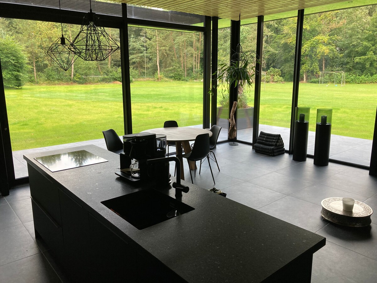 Luxe wellness aan de rand van het bos op de Veluwe. Uniek gastenverblijf voor twee personen met exclusief privégebruik van het overdekte zwembad, douches, eigen badkamer en (finse) sauna. Eigen inrit en volledig ingerichte keuken in parkachtige tuin. Geen dieren toegestaan! Het gebouw bestaat voor een groot deel uit (deels gespiegeld) glas en heeft geen gordijnen. Op fietsafstand van de Hoge Veluwe, station Apeldoorn en Paleis het Loo. Ideale locatie voor mountainbike, running en fietstochten.