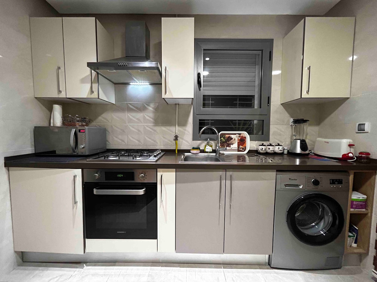 Przytulna przystań w Tunisie Zrelaksuj się w naszym spokojnym apartamencie, dogodnie położonym w cichej okolicy. Ciesz się szybkim dostępem do najważniejszych atrakcji Tunisu (lotnisko, dzielnica turystyczna, Carrefour, restauracja, sklepy, centrum miasta). Ta nowoczesna przestrzeń obejmuje jasny salon, balkon z panoramicznym widokiem, sypialnię z przebieralnią oraz w pełni wyposażoną kuchnię. Zrelaksuj się w jacuzzi w łazience, popływaj w basenie lub popracuj w przestrzeni coworkingowej. Gwarantowana całodobowa ochrona.