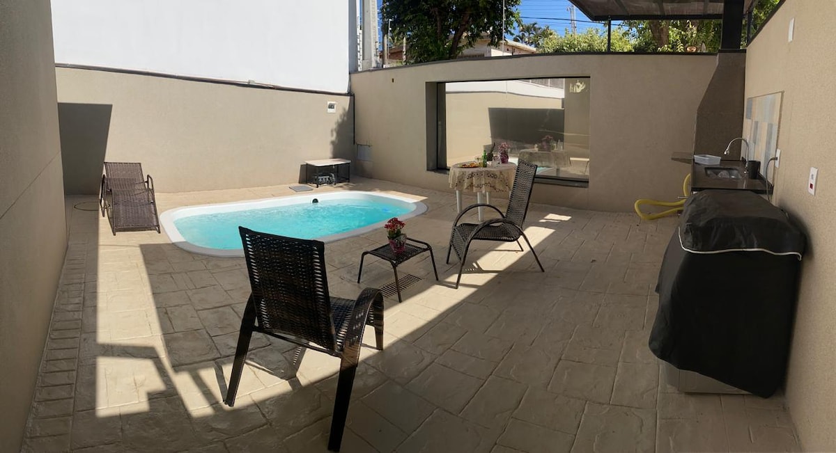 Relaxe neste espaço calmo e cheio de estilo. com conforto e com todos os utensilios de uma casa completa, com microondas e air fryr. Com uma linda piscina pra aproveitar e se refrescar durante todo ano pois detém aquecedor solar . Ar condicionado todo espaço churrasqueira pra um bom churrasco