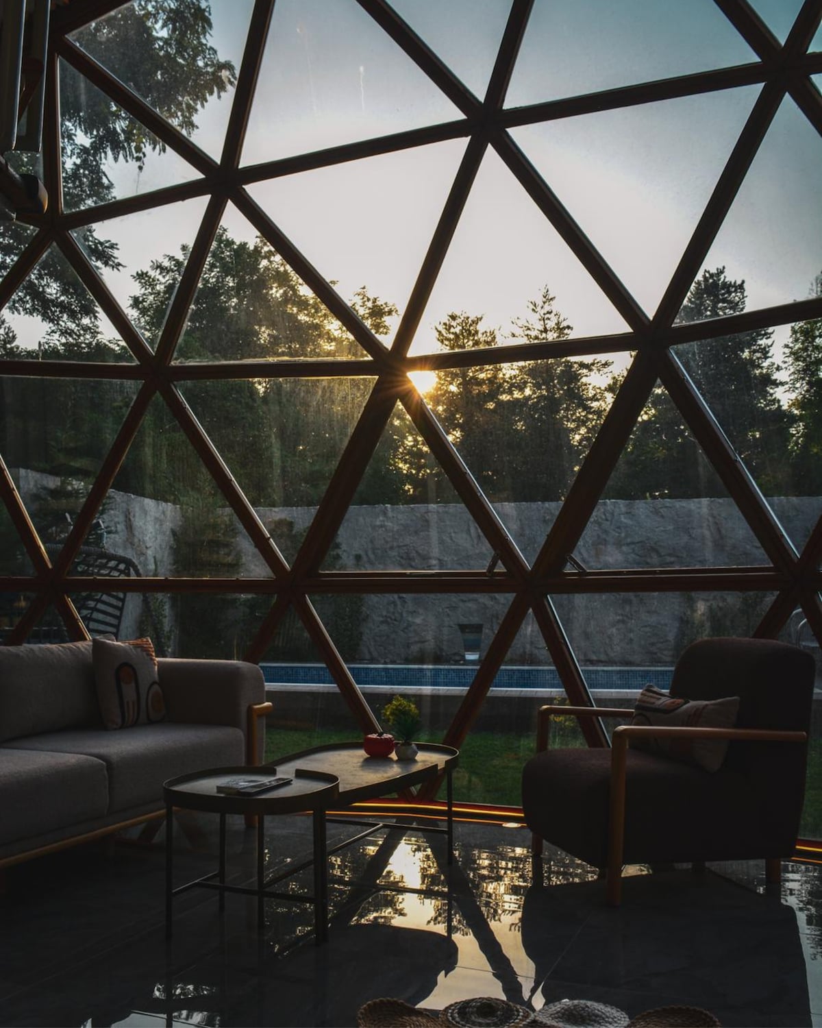 Miejsca na pobyt w domach kopułowych z przestrzenią do siedzenia na świeżym powietrzu