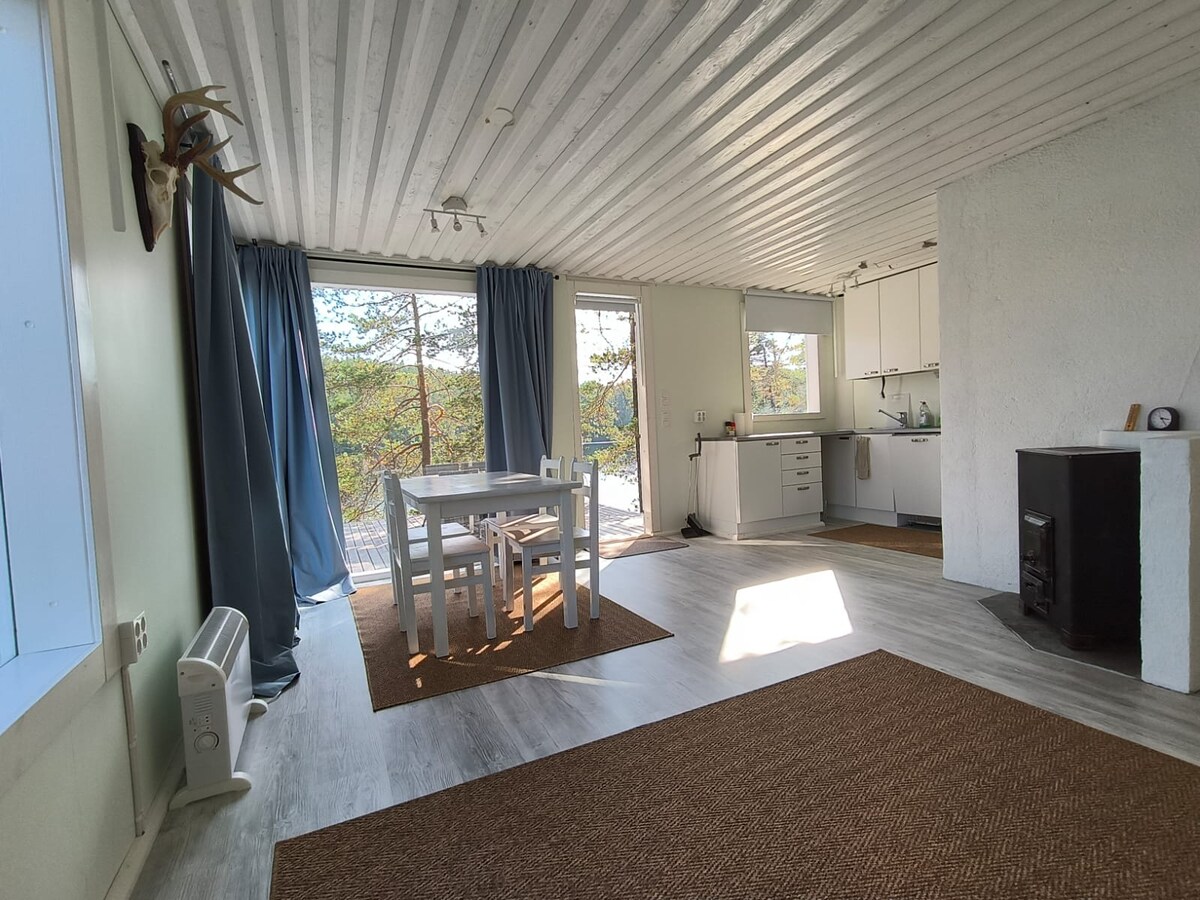 Przytulny domek między sosnami i jeziorem zaledwie 2 kroki od Saimaa. Wnętrze jest dość małe (30 metrów kwadratowych) z dużym otwartym tarasem i zielonym trawnikiem przed nim. Wewnątrz znajduje się łóżko na poddaszu dla 2 osób z widokiem, mała kuchnia, kominek, sauna na drewno. Wspaniale jest rozpocząć dzień od wczesnego pływania i jogi/śniadania na tarasie, słuchając śpiewu ptaków i zakończyć dzień przy kieliszku wina, robiąc zdjęcia oszałamiającego zachodu słońca.