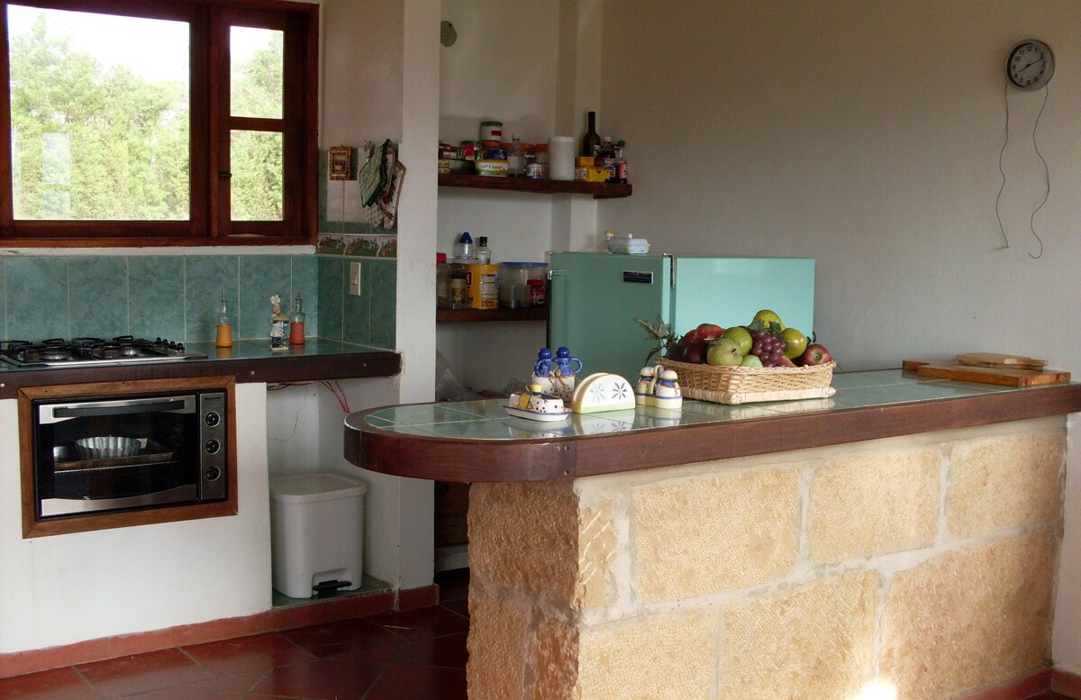 Alma Verde es mucho más que un hospedaje. Es tu casa de campo en un lugar de ensueño; un refugio natural, ubicado en un entorno natural privilegiado, muy cerca del casco urbano de Ráquira. Rodeado de naturaleza exuberante, árboles frutales y flores, que llenan el aire de fragancias y colores; un verdadero oasis de paz. La casa dispone de una habitación grande, cama king y sofá cama, además baño completo, también cuenta con cocina dotada, horno a leña, comedor y sala en un solo ambienté