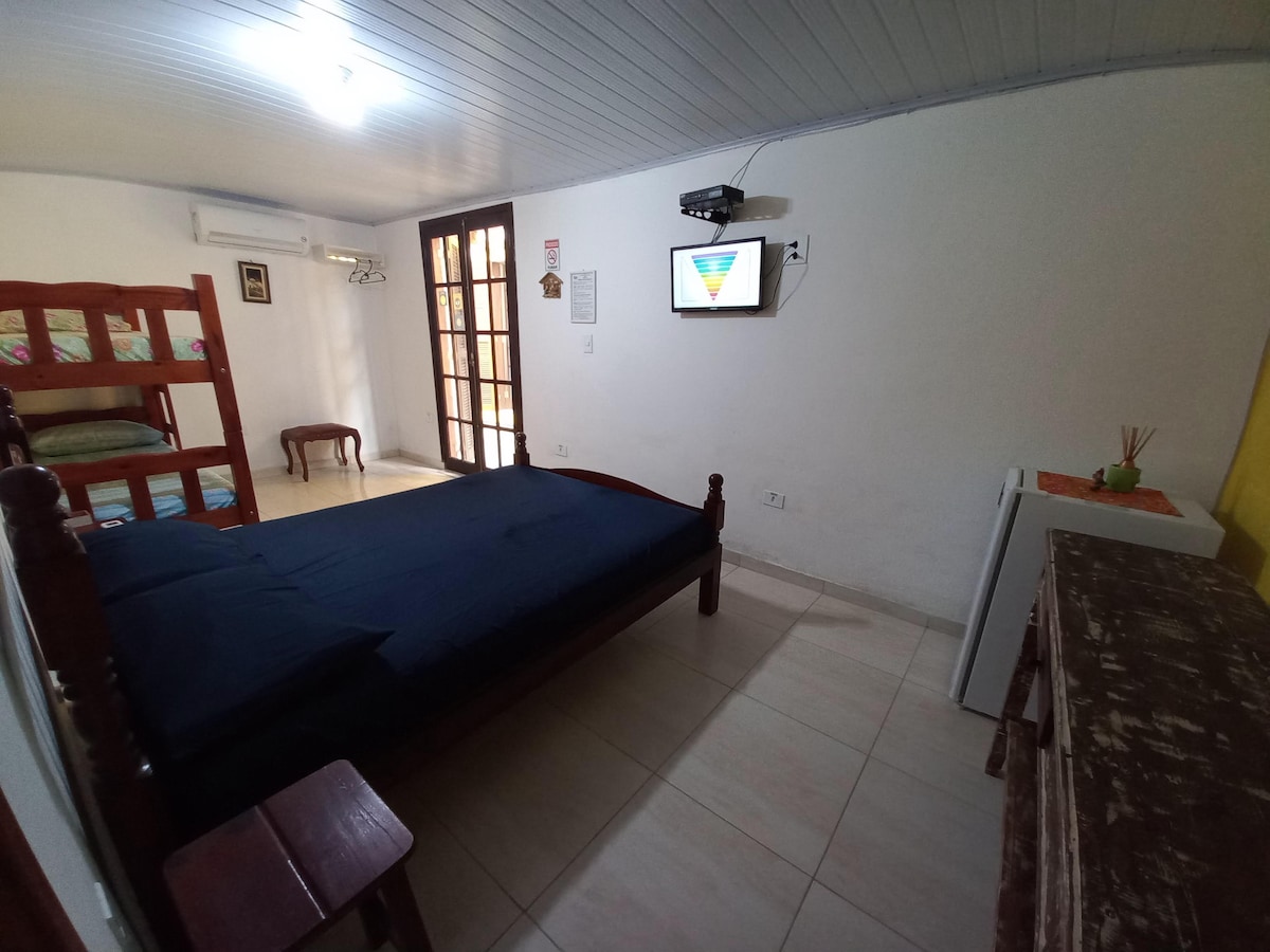 Esta acomodação oferece cama de casal e uma de solteiro, Ar-Condicionado SPLIT, TV de LED com canais abertos, roupa de cama e banho, Wi-Fi, frigobar, banheiro privativo.
