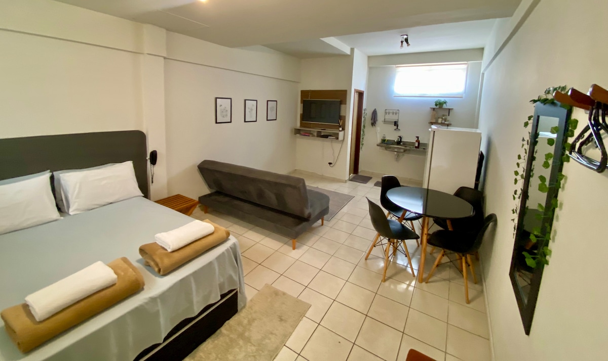 Studio Privativo e Individual com: - Wi-Fi - 1 Cama de casal com colchão com molas ensacadas + travesseiros com capa proteção anti-ácaro, 1 guarda roupa - 1 Ar-condicionado na sala - 1 espelho, 1 banco com almofadas, 1 TV - 1 Banheiro - 1 Bancada e 2 cadeiras - 1 Rede para descanso Banheiro - Mini cozinha com: 1 Armário 1 Fogão elétrico 1 Geladeira 1 Micro-ondas 1 Filtro de água natural Utensílios domésticos essenciais Garagem para 1 (um) veículo, necessário informar no ato da reserva