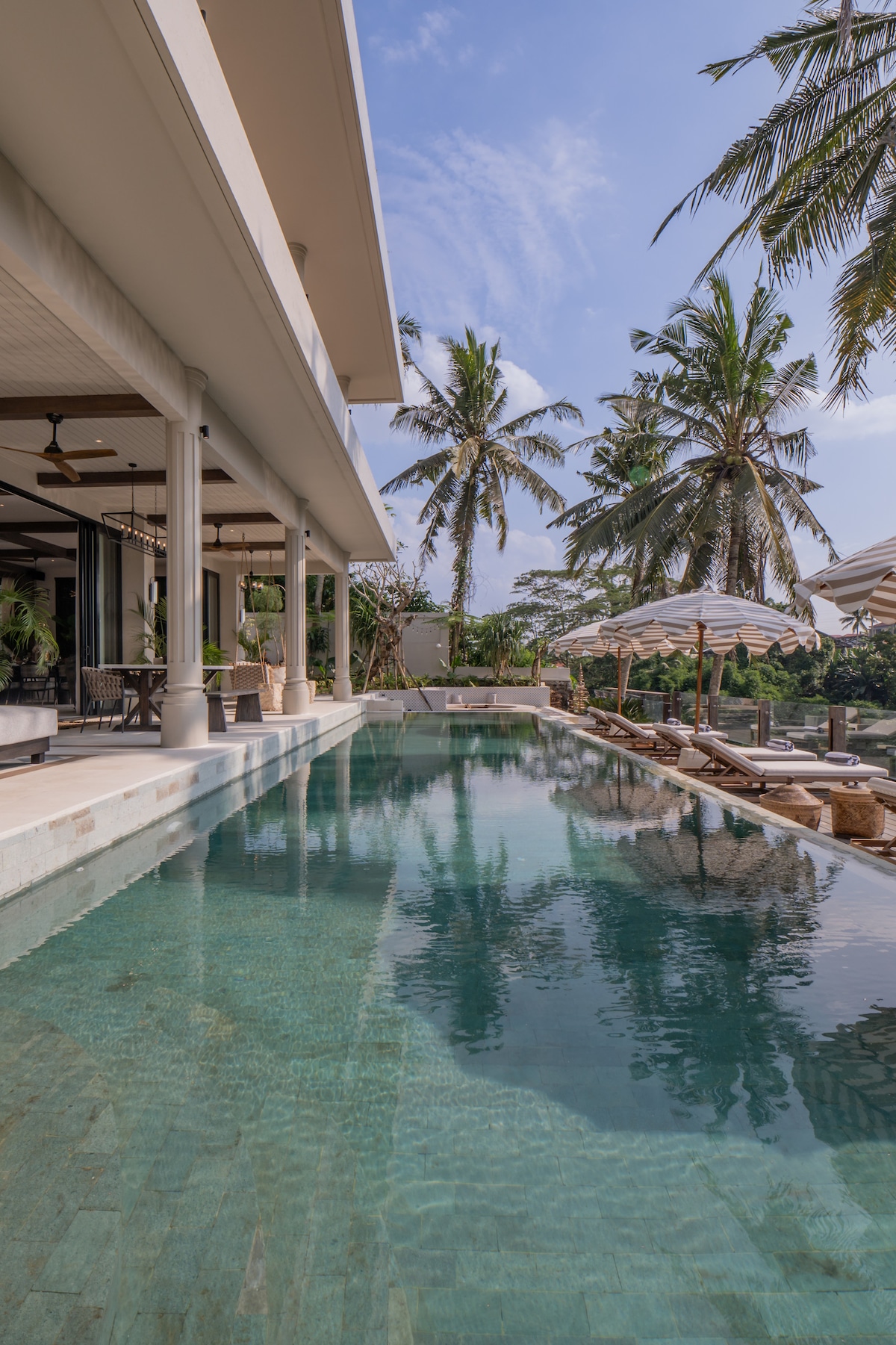 A newly built private 3bdr house for chasers of an authentic Indonesian character and a comfortable sleep. This 150 year-old solid wood redesigned house is full of eye-pleasing features. Based in a quiet cul-de-sac neighbourhood on top of a canyon. Offering ample natural light thanks to all-round glass doors and windows, our modern interior is light and dry. The long pool and yoga terrace are a bonus. A perfect spot for sunrise, Mt Agung and bird-watching!