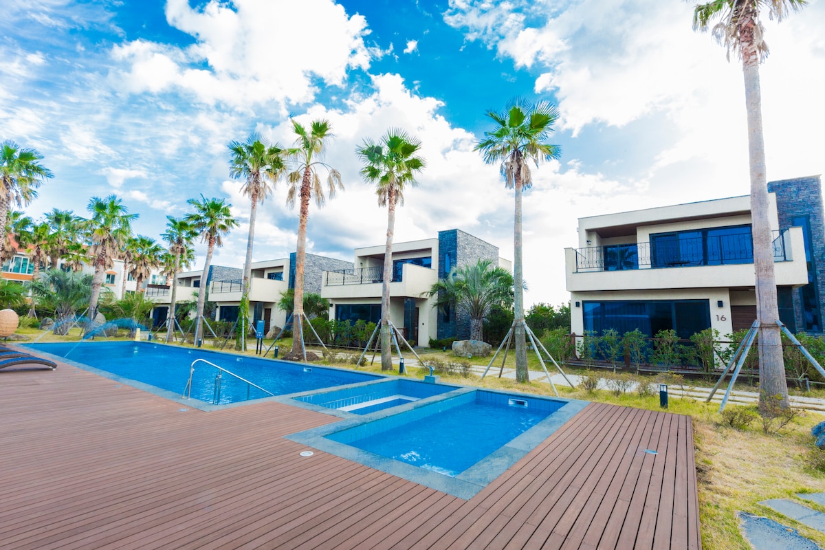 Wimigras, położony przy Wimicoast Road w Seogwipo, to nadmorski obiekt noclegowy z wspaniałym widokiem na morze i dźwiękiem fal z widokiem na Jiguido z plaży Black Stone Beach, spokój na końcu wioski rybackiej i unikalna willa zbudowana przy użyciu kamiennych domów Jeju. Możesz zobaczyć wyjątkową i piękną plażę Wimih Beach z wszystkich pomieszczeń, w tym z salonu, wszystkich pokoi i ogrodu. * Struktura i udogodnienia * Dom ma w sumie 3 pokoje, a każdy pokój ma umywalkę prysznicową Pierwsze piętro składa się z pokoju z łóżkiem i pokoju tatami z materacem, a w salonie i kuchni znajduje się stół do jadalni dla maksymalnie 6 osób oraz LG Standby Me.Do dyspozycji gości jest średniej wielkości lodówka, kuchenka mikrofalowa, czajnik elektryczny itp. Drugie piętro to pojedyncze łóżko w formie sypialni i salonu. Z kanapą, telewizorem itp. Z balkonu można poczuć scenerię Wimi Beach. Ogród kwatery jest podzielony na dwa podwórka, a przed kwaterą znajduje się trawnik i harmonijne dolne podwórko z kwiatami i roślinami.