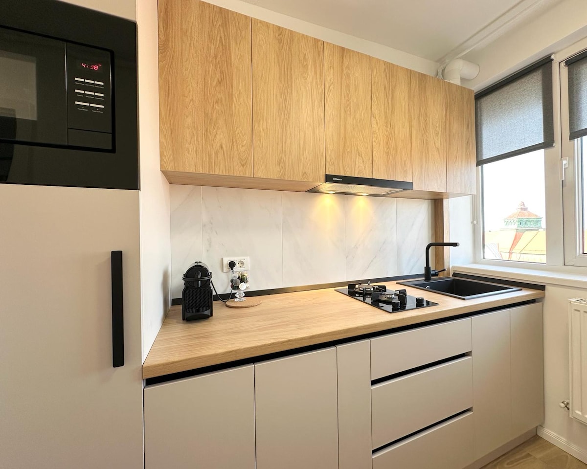 Nowoczesne mieszkanie z widokiem na miasto w pobliżu centrum