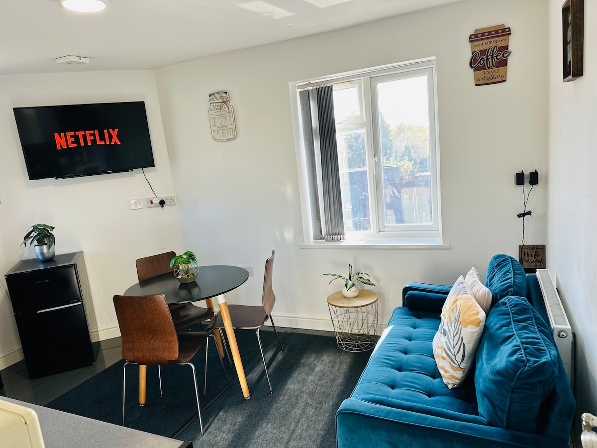 Bright, self-contained annexe on the 1st floor with private entry and lockbox for easy check-in. Features a king-size bed, sofa bed, dining area, and kitchenette with fridge/freezer, toaster, and tea/coffee facilities (no hob/oven). Mezzanine with two single beds, accessed by stepladder with lockable gate. Modern ensuite with shower and fresh towels. 42” TV with Netflix (no terrestrial TV). Private parking for 2–3 cars. EV charger available on request for a fee.