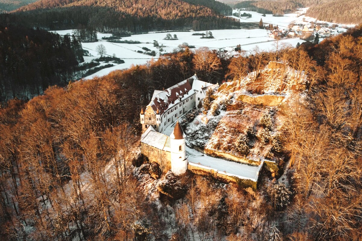 Zamek (XIII wiek) z fosą z ogrodem warzywnym, kamiennymi murami, stawem, 60 winoroślami, figami, historycznymi odmianami owoców, sałatami, własną pszczelarnią. 4 pokoje dwuosobowe (każdy z prysznicem i toaletą). Możliwość wynajmu kaplicy zamkowej i sal eventowych. Rozkładana sofa lub łóżeczko dziecięce na życzenie. Regensburg w 20 minut. Wędrówki od drzwi wejściowych. Na trasie rowerowej. Wspaniałe miejsce do napisania niedokończonej powieści lub na wakacje. Właściciele mieszkają na najwyższym piętrze.