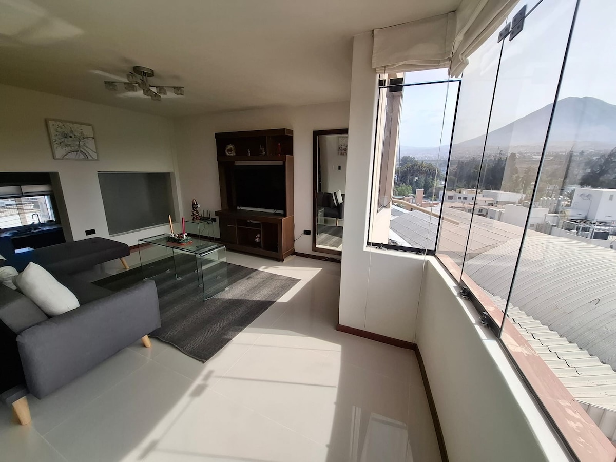 Piękne mieszkanie na 4 piętrze, najlepszy widokaz na aleję Bolognesi, spokojna okolica, położone w tradycyjnej dzielnicy Yanahuara, 10 minut spacerem od historycznego centrum miasta, 5 minut od placu Yanahuara i 10 minut od centrów handlowych i banków. 3 komfortowe pokoje z łóżkiem typu Queen, prywatna łazienka, pokój rodzinny i towarzyski, biurko, kuchnia śniadaniowa, patio, jadalnia i balkon w kierunku alei i klubu Inter. Po południu z balkonu będziesz podziwiać przyrodę z chmarą papug i zieloną okolicą.