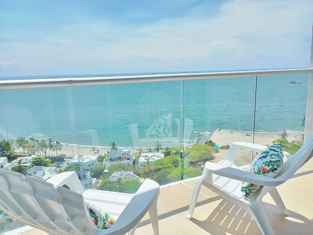 Apto nuevo frente al mar y la reserva natural Pozos Colorados. Impresionante vista a la playa y ubicación inmejorable: a 300 m de la playa, 5 min del aeropuerto y cerca de restaurantes, centros comerciales y el emblemático Rodadero. Amenidades de alta calidad: habitaciones con camas Dobles A/C, baños Social y privado con agua caliente, sala con sofá cama y acceso a balcón panorámico. Cocina equipada, Smart TV. Piscina y seguridad 24/7. ¡Vive una experiencia única en Santa Marta!