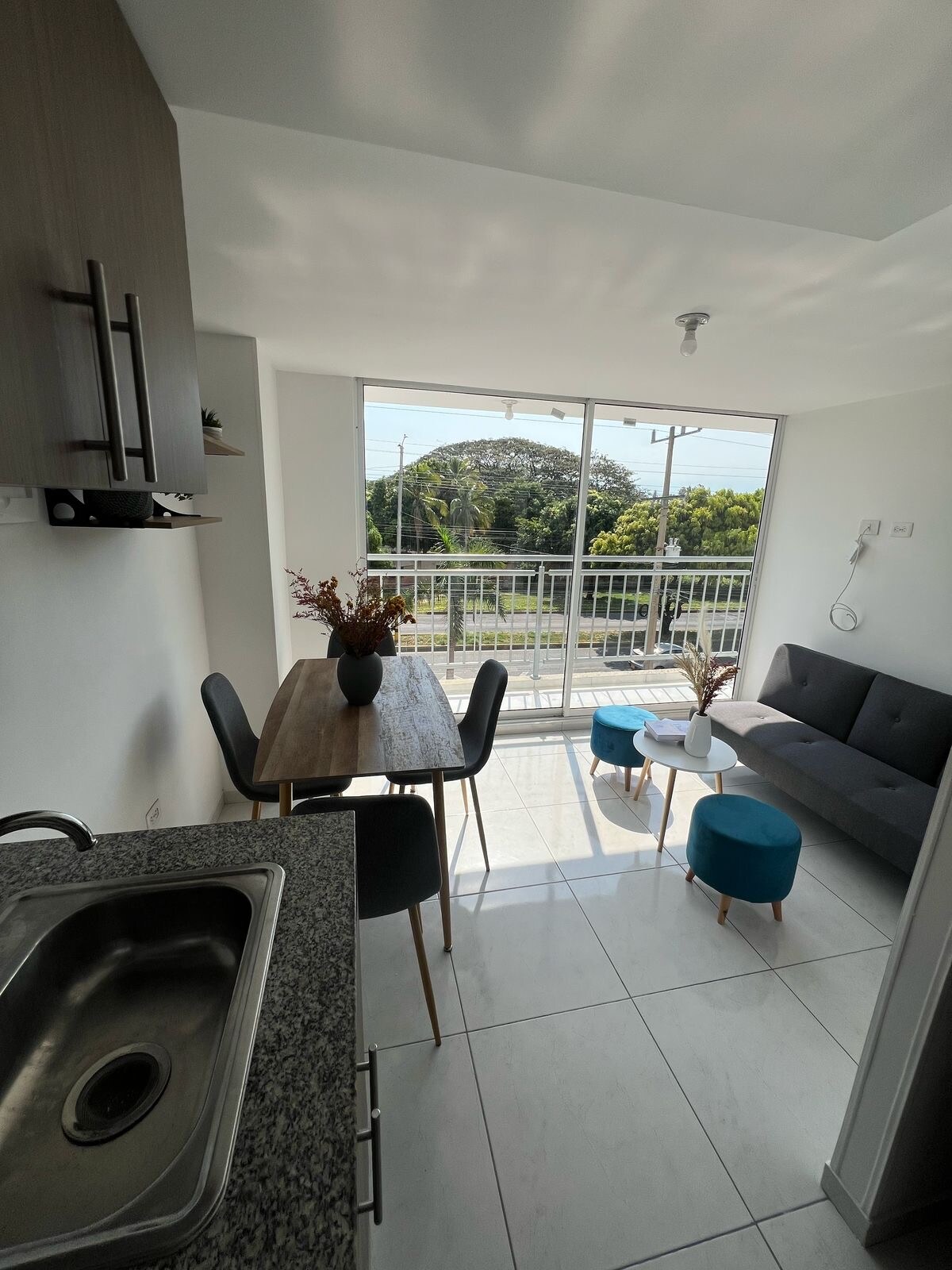 Modern and fully equipped apartment in north Valledupar, located behind Universidad Andina. It features 2 bedrooms, 2 bathrooms, living room with Smart TV, high-speed WiFi, air conditioning, equipped kitchen, dining area, and exclusive parking. Strategically located, ideal for quiet, family, or academic stays.
