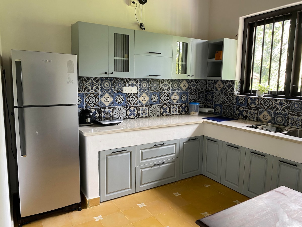 Dom posiada dwie sypialnie z podwójnym łóżkiem, klimatyzacją i łazienkami; jedną z podgrzewaczem wody i wspólną łazienką. Dodatkowy podwójny materac dostępny w jednej sypialni. Przestronny hol ma stół jadalny z 6 krzesłami, zestaw sof i diwan. Kuchnia z miejscem do pracy ma lodówkę, oczyszczacz wody, sprzęt do gotowania itp. Korytarz prowadzący do pokoju Pooja i patio z boku centralnego dziedzińca są idealne do relaksu. Wszystkie są dobrze wentylowane, wyposażone w moskitiery i przeznaczone wyłącznie dla gości.