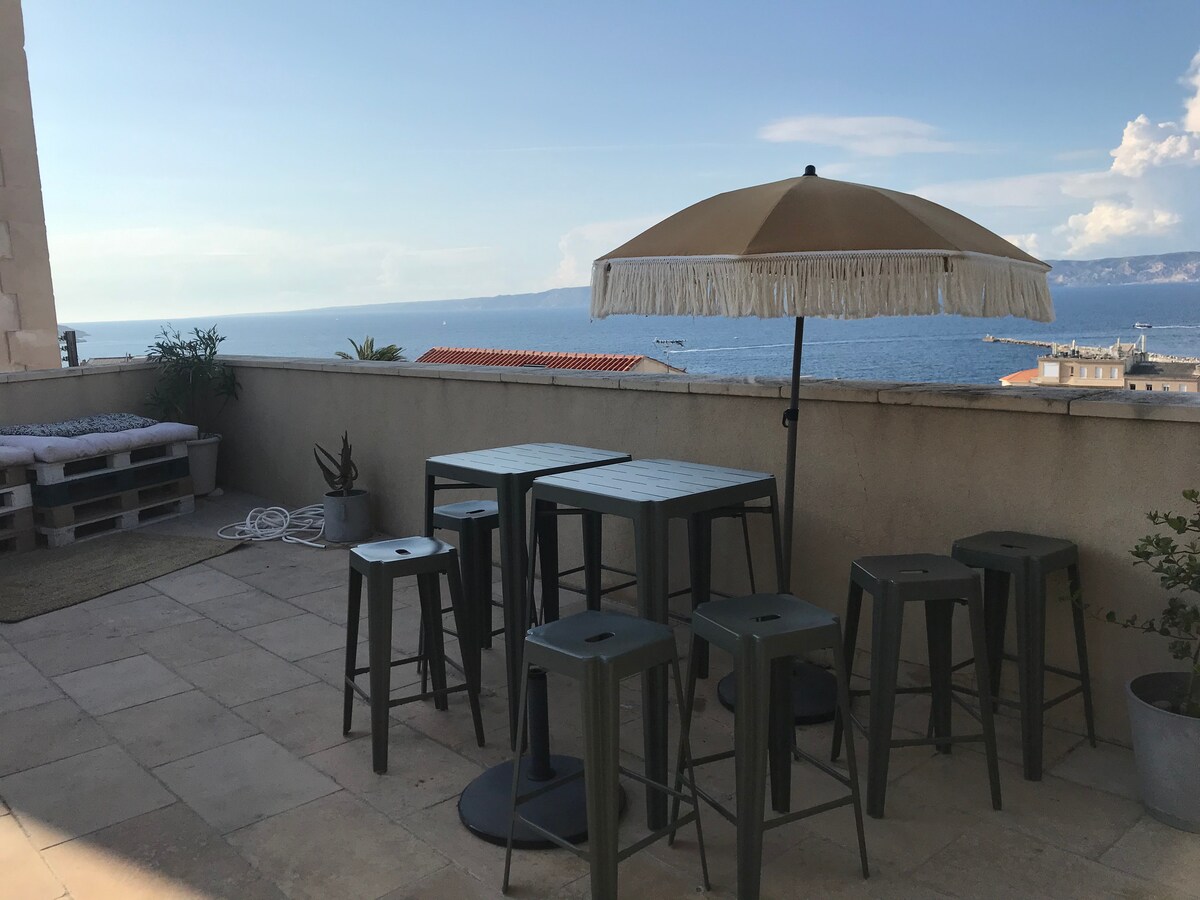 Jasny apartament z panoramicznym widokiem na morze z każdego pokoju. Będziesz podziwiać zapierające dech w piersiach zachody słońca z dużego tarasu, zrelaksujesz się w hamaku i będziesz cieszyć się widokiem! Dogodnie położony w samym sercu Endoume, jednej z najlepszych dzielnic Marsylii, zaledwie 2 minuty spacerem od morza! Klimatyzacja + szybkie i niezawodne Wi-Fi.