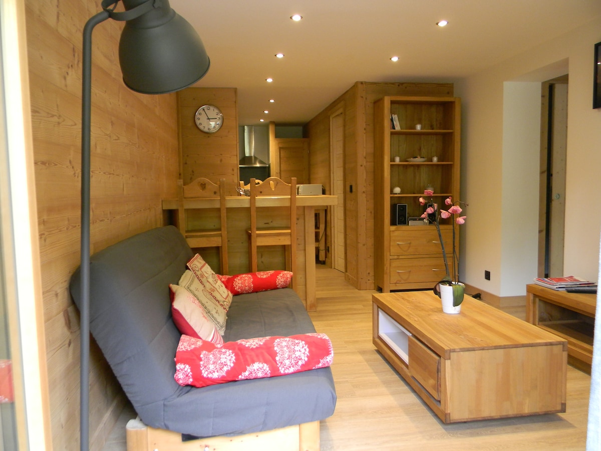 Urokliwe studio w Les Praz, z widokiem na południe, z prywatnym ogrodem i tarasem oraz zapierającymi dech w piersiach widokami na całe góry Mont Blanc. Idealna lokalizacja, w połowie drogi między centrum Chamonix a uroczą wioską Les Praz. Z dala od hałasu, ale w odległości spaceru:-) Niedawno odnowione, łączące drewno z nowoczesnością, to studio o powierzchni 22 metrów kwadratowych może pomieścić maksymalnie 4 osoby (1 nowa (18 września) sofa 140cm i 2 wysuwane łóżka piętrowe).