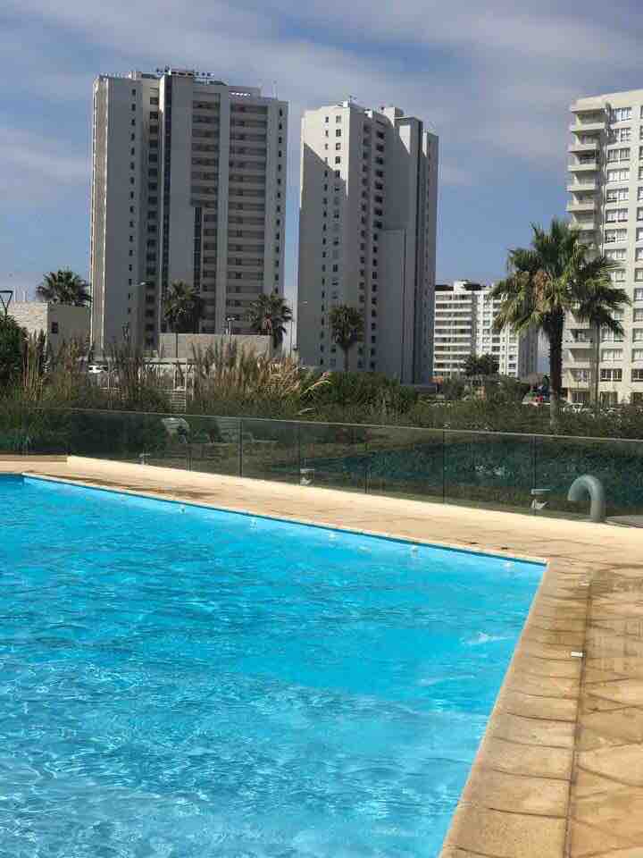 Cabaña una habitación grande, hasta 4 personas, terraza espaciosa frente al mar. 1 baño; cama y sofá cama 2 plazas; 1 closet; comedor, cocina equipada, parrilla gas ; TV SMART, WI FI ENTEL 400 MB FIBRA OPTICA; parlante, cerradura con clave; un estacionamiento interior gratuito .Piscina grande; conserje 24 horas, cámaras. Mascotas: Solo perros, cargo adicional 10.000. Terraza en altura., camino con escalas. Ingreso: 15.30 horas flexible. Salida: 12.30 horas, conversable. No lavandería.