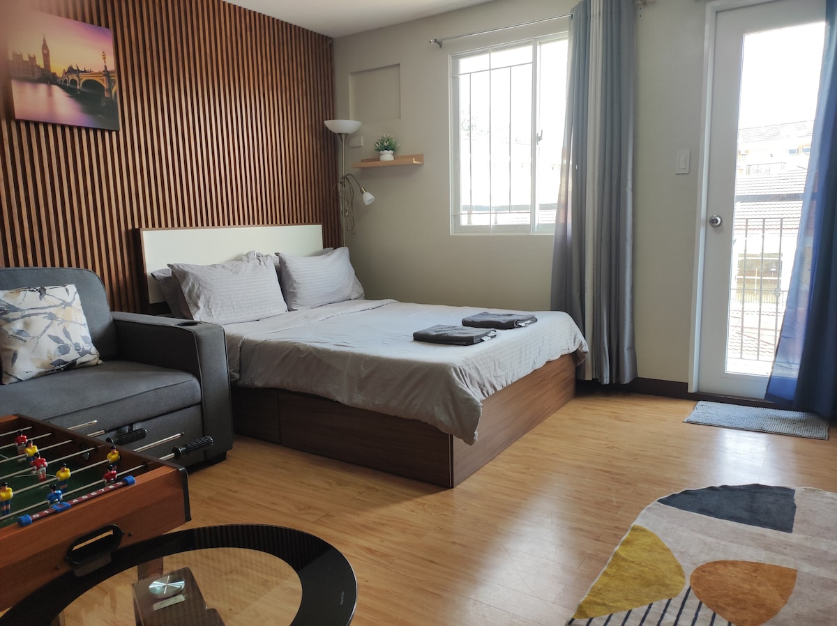 Studio o powierzchni 35 m² z balkonem • Wi-Fi 200 Mb/s • Duże łóżko (king) + 2 materace podłogowe • W pełni wyposażona kuchnia + drewniane podłogi • Pralka • Bezpłatna ciepła i zimna woda • Ogrodzony apartament z całodobową ochroną • 2 baseny + plac zabaw • Sklep 7/11 i targ tuż przy wejściu W pobliżu (samochodem): • Prom Samal – 3 minuty • Lotnisko – 8 minut • Dusit Thani – 8 minut • Insular Hotel – 10 minut • Puregold – 7 minut • Azuela Cove – 12 minut • SM Lanang / SMX – 15 minut