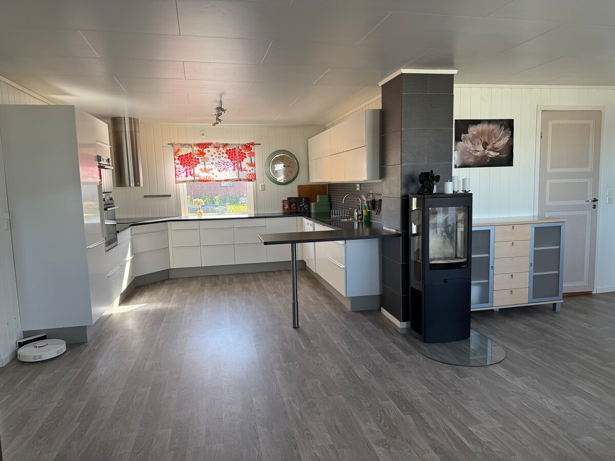 Duży dom ze wspaniałym widokiem na morze i Hornøya. Okolica przyjazna rodzinom i spokojna okolica. Masz cały dom, z wyjątkiem garażu i części na piętrze cokołu, która jest zamknięta. Na parterze znajduje się sypialnia z 1 miejscem do spania, mały kącik do pracy (biurko), salon i w pełni wyposażona kuchnia. Na drugim piętrze znajduje się sypialnia z podwójnym łóżkiem i sypialnia z pojedynczym łóżkiem. Na półce znajduje się również pralnia z pralką.