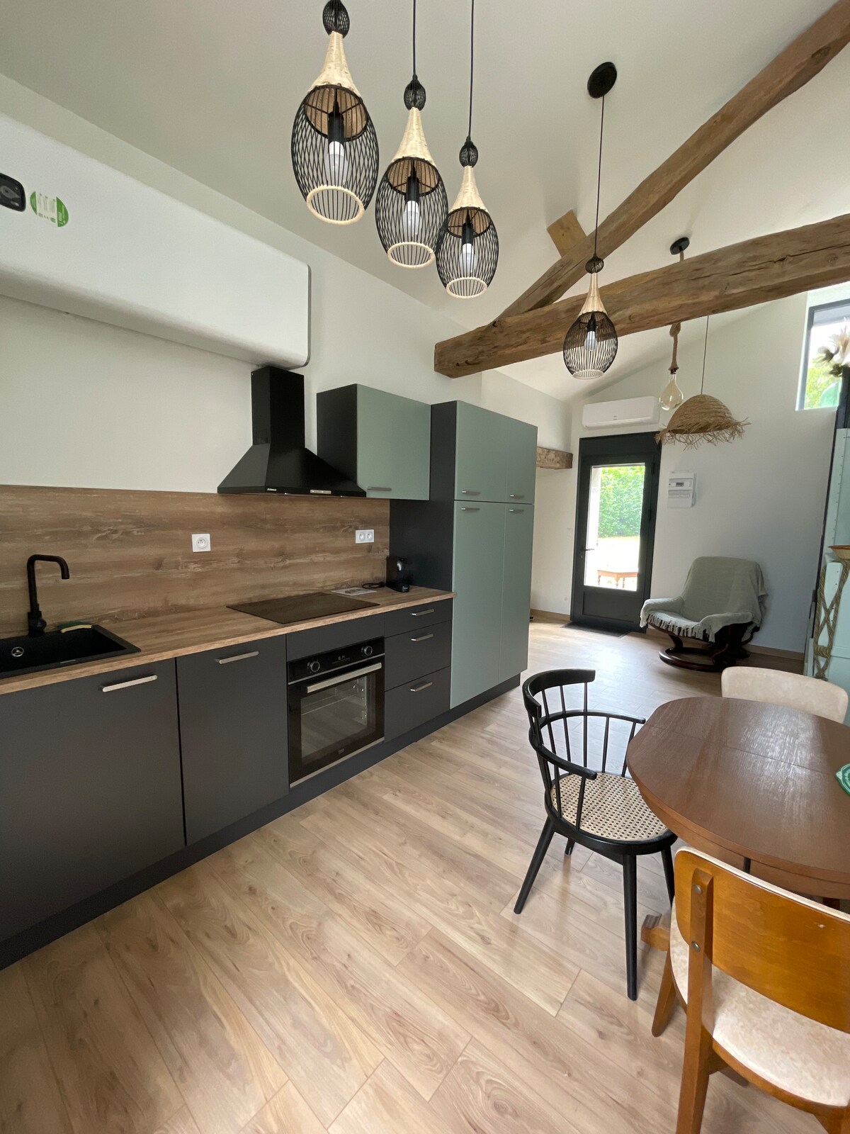 Do odkrycia, nowy i bardzo jasny domek w spokojnym miejscu, otoczony zielenią. Składa się z: Na parterze: - 1 pokój dzienny z aneksem kuchennym + część wypoczynkowa z telewizorem - sypialnia z łóżkiem 140 x 190 cm - łazienka z prysznicem i umywalką - oddzielna toaleta Na piętrze: - antresola o powierzchni 25 m2 z 1 łóżkiem 140x190 + 1 łóżkiem 90x200 + telewizorem Prywatny taras z meblami ogrodowymi i parasolem, położony obok boiska do petanque, zapewnia przyjemne chwile.
