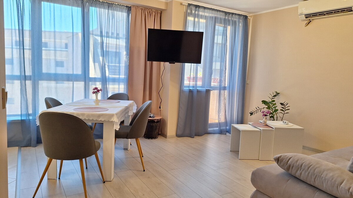 Stylowy apartament w centrum z pięknym widokiem na miasto | 2 sypialnie + balkon | Warna Witamy w EpiCenter Varna – Twoim stylowym 2-pokojowym miejscu na wypoczynek w sercu miasta! Nasze mieszkanie o powierzchni 58 m² ma bezkonkurencyjną lokalizację, przytulny salon, w pełni wyposażoną kuchnię, balkon z widokiem, nowoczesną łazienkę i szybkie Wi-Fi. Zaledwie kilka kroków od Sea Garden, plaży, restauracji, sklepów i nocnego życia. Idealne dla par lub rodzin szukających wygody i komfortu.