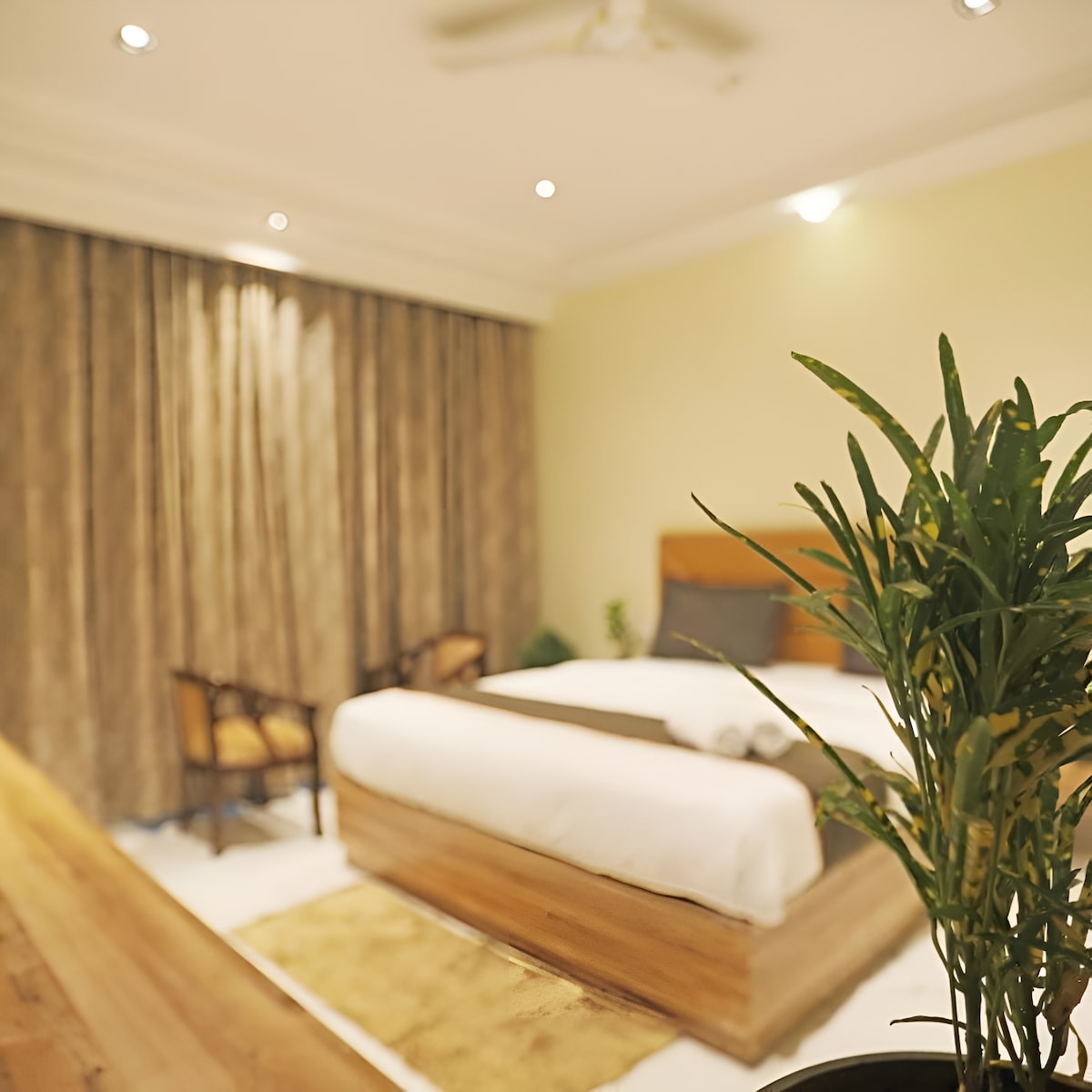 Experience luxury and privacy in this beautiful rooftop suite this modern hideaway combines sophisticated interiors with a serene outdoor retreat — perfect for couples or solo travelers seeking comfort and style. Located on the 5th floor (lift access till 4th), the suite welcomes you with a spacious bedroom, warm lighting, and elegant wooden finishes. Step outside to your private terrace, an oasis designed for relaxation. The highlight — a jacuzzi under the open sky