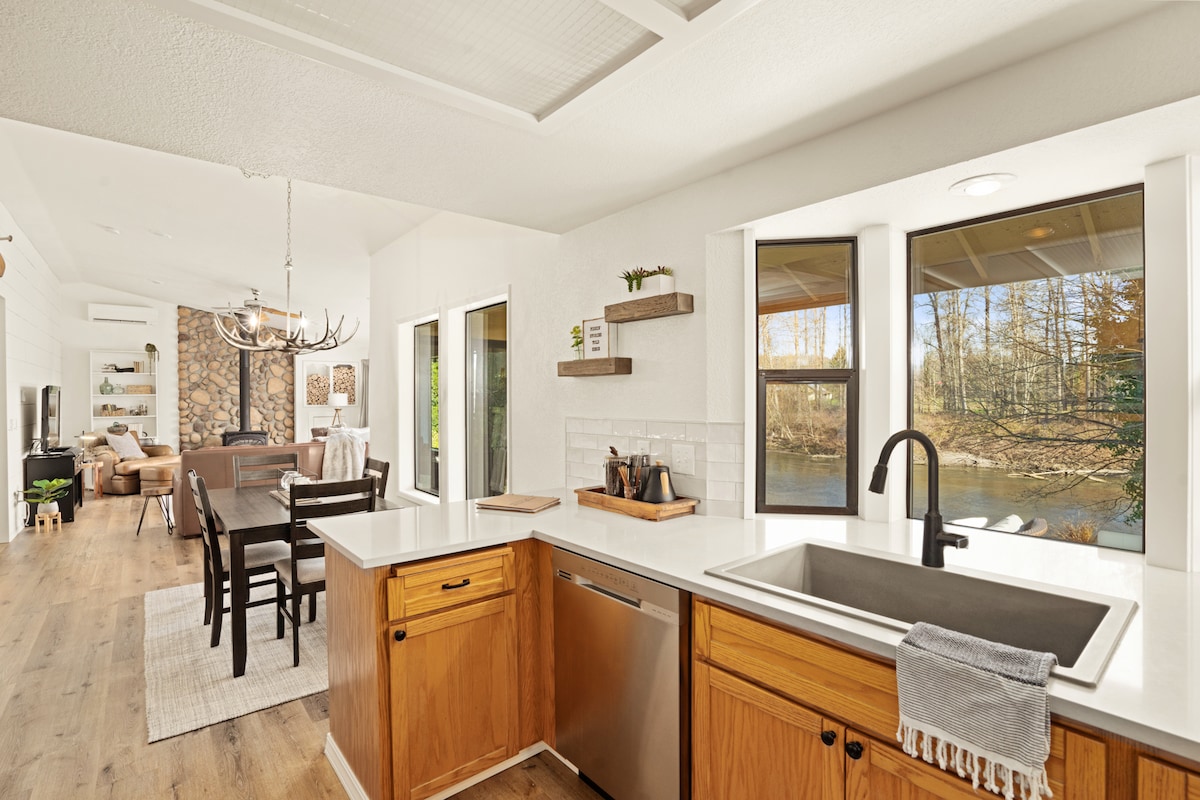 Cozy riverfront oasis in walkable downtown Puyallup—perfect for relaxing or exploring. Inside - Open-plan living with river-rock fireplace & antler chandelier - Chef’s kitchen fully stocked for serious cooking - 2 comfy bedrooms, hotel-quality linens Outside - Saltwater hot tub for 4 - Covered patios, BBQ & fire-pit on the water’s edge - Walk to restaurants, Riverwalk Trail & farmer’s market; 30 min to Sea-Tac, 1 hr to Mt Rainier.
