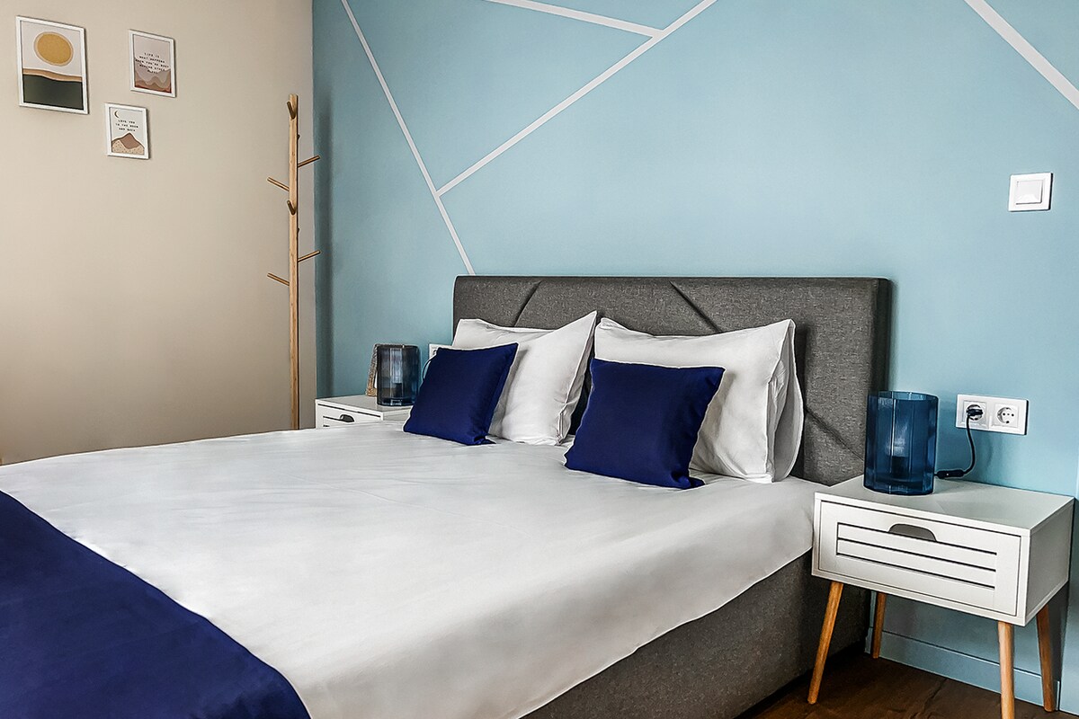 Nowoczesna klasyka z wyraźnym akcentem jest wiodącą koncepcją przy tworzeniu tego apartamentu. Postawiliśmy na stylową przestrzeń z estetycznie dopracowanymi meblami. Niebiesko-szara paleta kolorów zapewnia elegancki, zrównoważony komfort, a słoneczny kolor - wyrazistość i radość. W ten sposób stworzyliśmy apartament dla każdego gościa miasta, który szuka komfortu i stylu na swój krótki lub długi pobyt.
