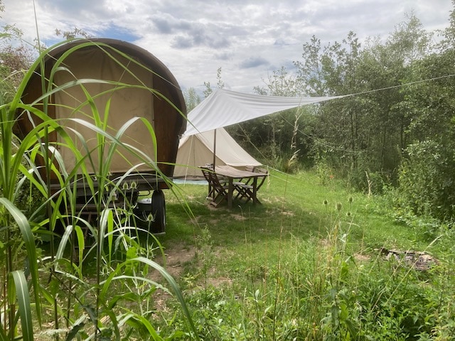 Huifkar met canvas tent in de natuur