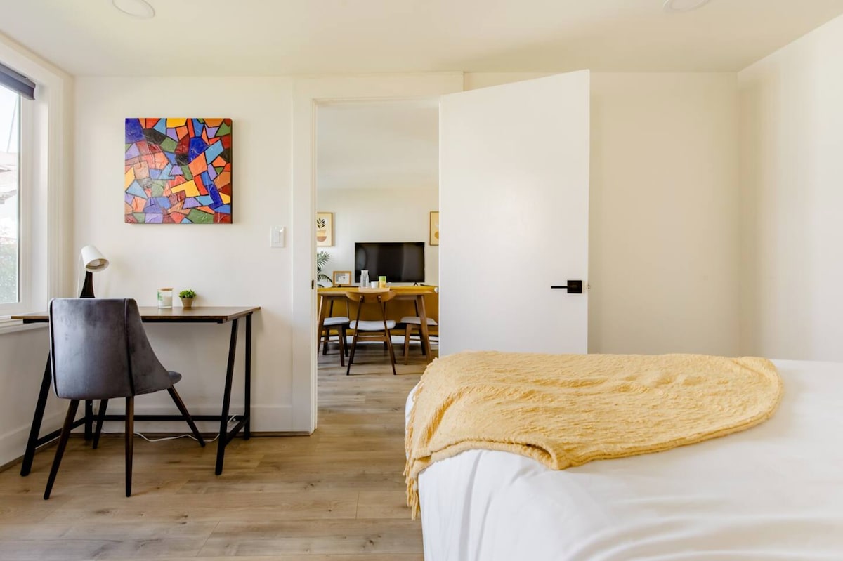 Eklektyczny domek po drugiej stronie ulicy od historycznych kanałów Venice. Zakupy, kolacje, spacery, jazda na rowerze, jazda na łyżwach, surfing lub wiosłowanie. Plaża, słynny Boardwalk, Abbot Kinney Blvd.Marina del Rey jest w odległości kilku kroków. Serce „Silicon Beach” i mniej niż 5 mil od LAX. Łatwy spacer do Erewhon, świetne lokalne i najlepsze restauracje szefa kuchni, zakupy, szeroka piaszczysta plaża i mnóstwo lokalnej zabawy. Wygodna baza wypadowa do odkrywania całego SoCal. Jest to przytulna sypialnia z łóżkiem typu Queen i podwójną rozkładaną sofą.