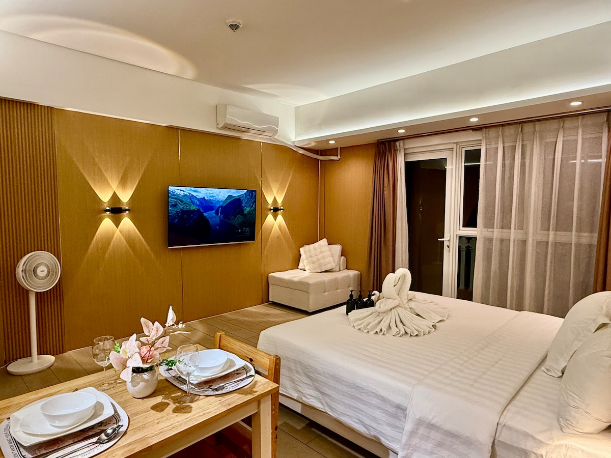 Witamy w The Lush Pad – gdzie zawsze staramy się uciec od zwyczajności! Przedstawiamy nasze gustownie zaprojektowane studio typu executive, które przeniesie Cię na luksusowe europejskie wakacje w centrum Taguig City! Miękkie ściany w kolorze szałwii oraz drewniane akcenty nadają temu miejscu osobliwy, a jednocześnie domowy charakter – zdecydowanie można poczuć się jak w Wenecji!