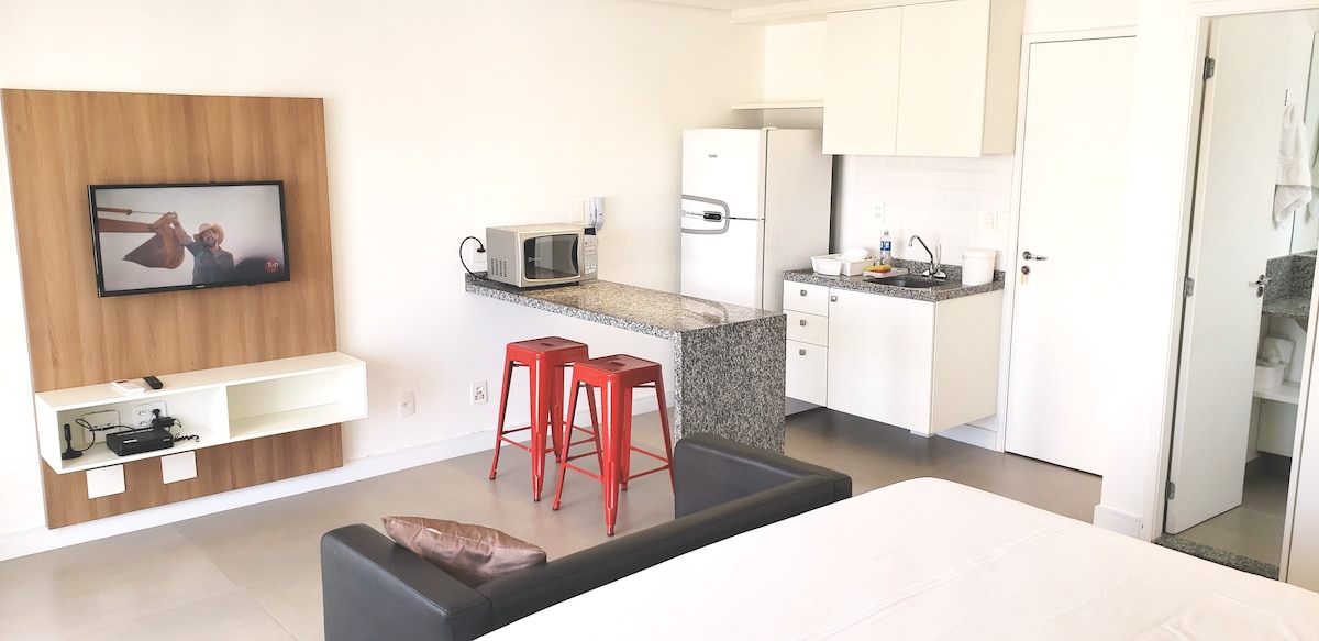 Loft novo, decorado com charme e elegância nas Perdizes. Quarto confortável e todo equipado com cama King Size, Geladeira, Fogão de Indução, Máquina de Lavar, Escritório com Internet Cabeada , TV 4K 55 Polegadas, Wi-Fi. 300m do Shopping Bourbon.