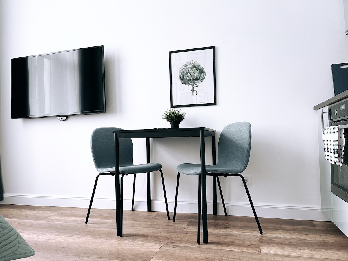 New! Cozy studio apartment - walking distance to everything you may need. King size bed (200x200) with high quality mattress. Also - a single sofa chair, for the third guest. Apartment is located in a renovated building on one of the main streets of Riga. Brand new furniture and appliances. Modern interior. 5 minute distance from Old town, central station. The National Opera, theatres, museums, exhibition galleries, concert halls are all within short walking distance.