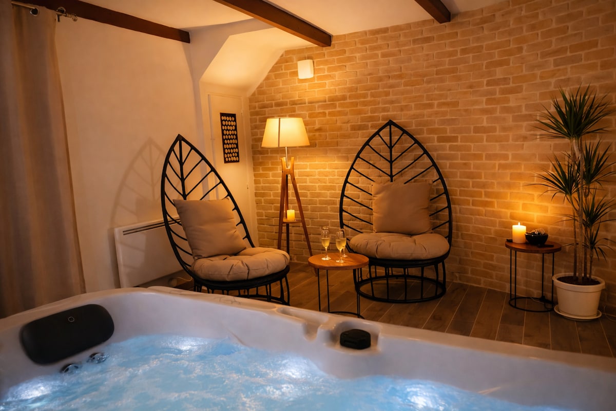 Cały dom sprywatyzowany o powierzchni 50 m² na dwóch poziomach, idealny na romantyczny wypad dla dwojga w Ardèche. Do dyspozycji prywatne 3-osobowe spa z 50 dyszami i terapią światłem, przytulny salon z gwiaździstym niebem i sypialnia z łóżkiem typu queen size oraz wyposażony aneks kuchenny. Oddzielne wejście zapewniające całkowitą prywatność. Ocenione na 4,99⭐ przez prawie 500 par. Wszystko zaprojektowano tak, aby zwolnić tempo, spotkać się i przeżyć niezapomnianą chwilę we dwoje.