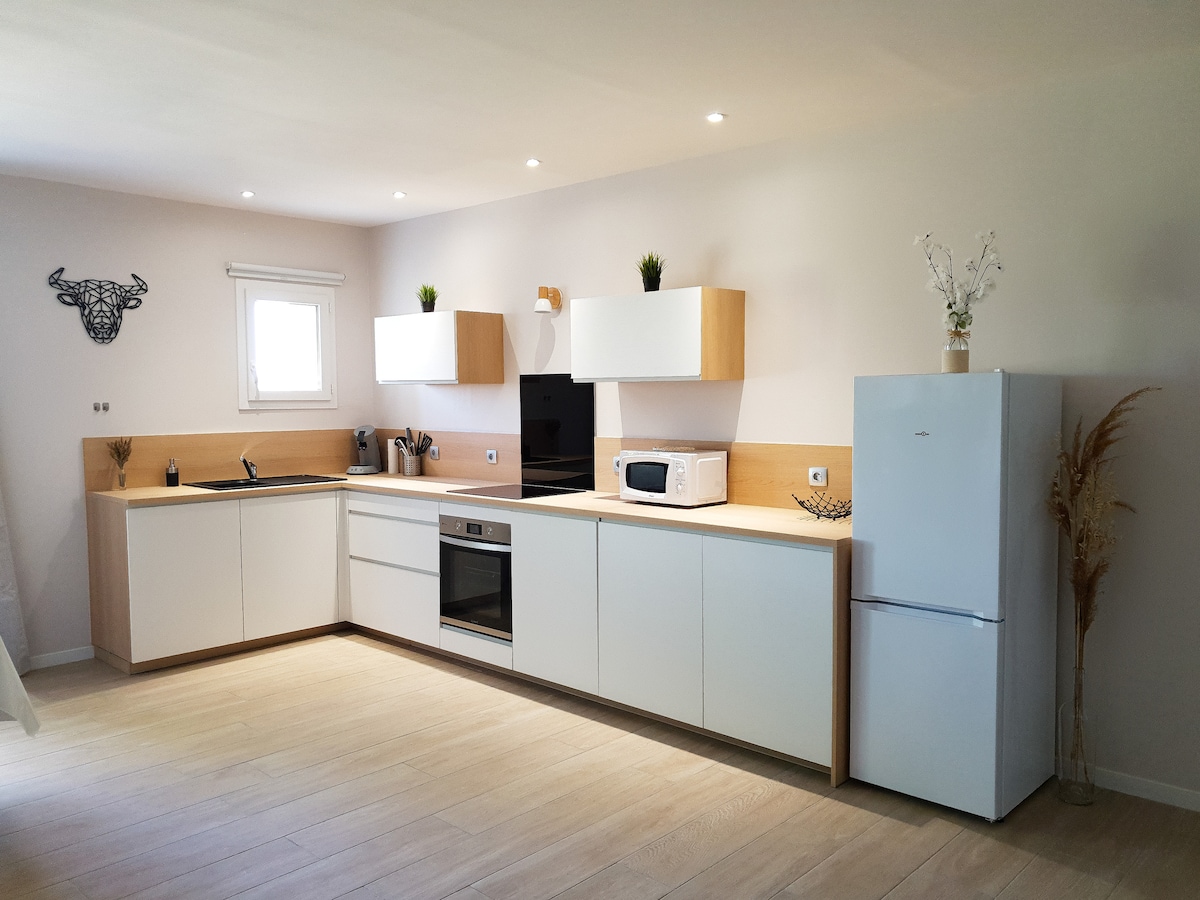 2 km od centrum Grau d 'Agde i 800 m od plaży (ścieżka rowerowa), mała willa (35m2) niezależna F2 położona w posiadłości rodzinnej. Secteur camping Les Sablettes accommodation composed of _salon z wyposażoną kuchnią, rozkładany na 140 cm (idealny dla dzieci), stół i krzesła _ sypialnia z łóżkiem 140 cm, telewizor. _łazienka z łazienką do sypialni z włoskim prysznicem _80m2 otoczony murem ogród z miejscem parkingowym i wyposażonym tarasem. -clim i wifi - ręczniki i pościel