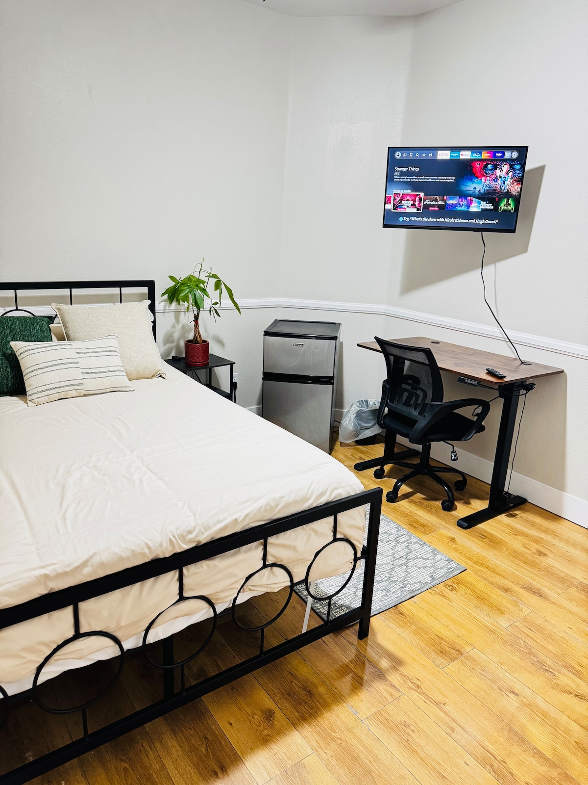 Apartament gościnny z 1 sypialnią i 1 łazienką ~ 350 stóp kwadratowych Prywatne wejście (bez klucza) Termostat osobisty Bezpłatne przekąski, napoje i przybory toaletowe Materac Queen Tempur Pedic z podstawą 65-calowy telewizor Smart HDTV w salonie 55-calowy telewizor Smart HDTV w sypialni Mini lodówka Elektryczna podwójna kuchenka Maszyna Keurig Gry planszowe Biurko
