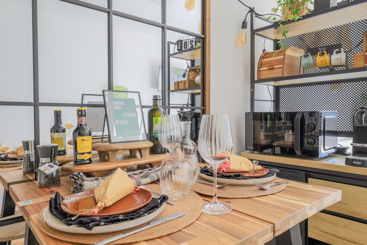 To mieszkanie zostało starannie odnowione z poszanowaniem jego długiej historii. Jego uprzywilejowane położenie w sercu starego Lille, 10 minut spacerem od Wielkiego Placu i dworców kolejowych, sprawia, że jest to idealne miejsce do odkrywania Lille. Ponadto mieszkanie jest bardzo ciche, ponieważ wychodzi na mały, typowy dziedziniec, a nie na ulicę. Wystrój został zaprojektowany z poszanowaniem autentyczności tego miejsca, a jednocześnie zapewnia wszelkie wygody mieszkania XXI wieku.