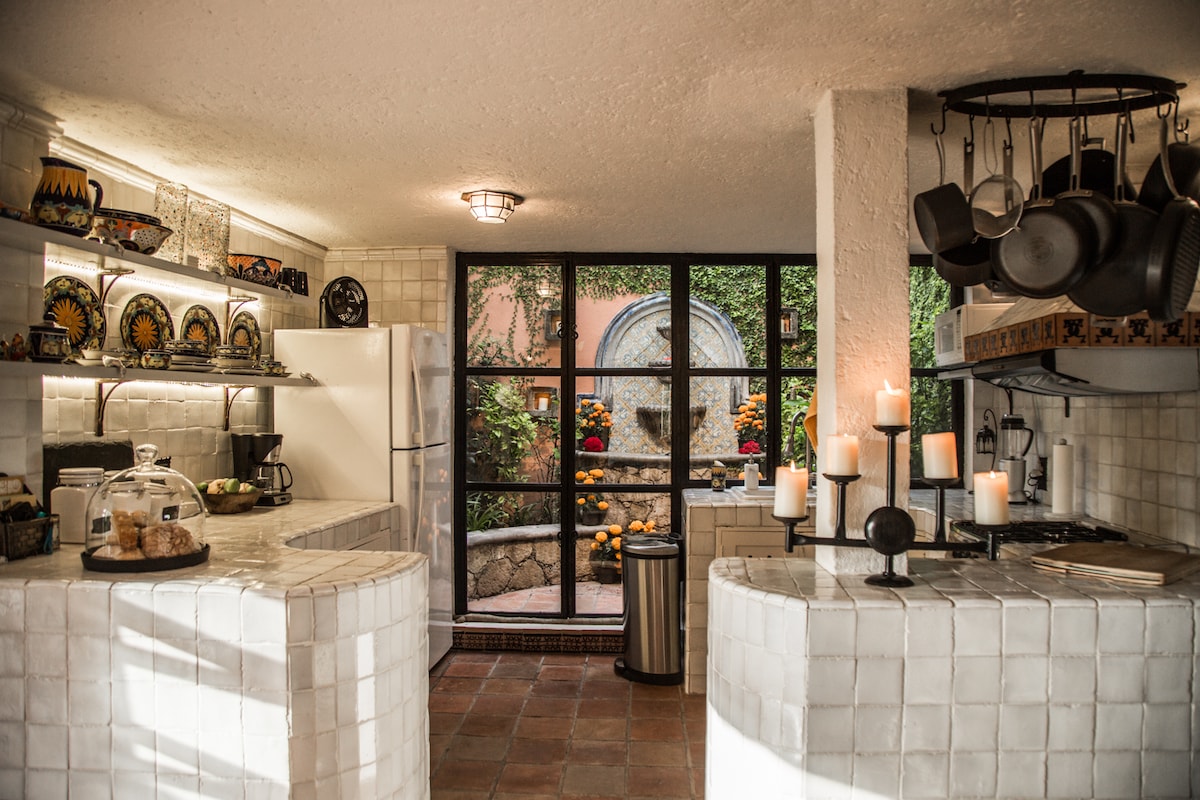 Wspaniałe widoki i lokalizacja. Bezpośrednio nad Parque Juarez i w dół od punktu widokowego Mirador. Zaledwie kilka przecznic od głównego placu. Nasz dom znajduje się za i nad inną nieruchomością, umożliwiając spokojną i prywatną scenerię, podziwiając jednocześnie oszałamiające panoramiczne widoki na centrum San Miguel, jego kościoły i odległe tereny wiejskie. Cztery poziomy tej nieruchomości pozwalają na jasną definicję przestrzeni, ale podzieloną na siebie, tworząc poczucie amplitudy, jednocześnie czerpiąc korzyści z bujnej zieleni otaczających drzew i ścian porośniętych winoroślą. Wiele tarasów i fontann nadaje ton relaksującej atmosfery w czystych, jasnych wnętrzach, które przypominają Morze Śródziemne. Na poziomie głównym znajduje się salon, jadalnia i w pełni wyposażona kuchnia z systemem oczyszczania wody w całym domu, a także balkon i sypialnia gościnna z łazienką. Poniżej znajduje się prywatny ogród ze studiem zapewniającym idealną atmosferę do twórczości artystycznej. Główna sypialnia, znajdująca się na piętrze, jest niesamowita, szeroka i otwarta. Centralne łóżko typu king size wychodzi na widok, francuskie drzwi i balkon. Łazienka z łazienką jest wyposażona w duży prysznic i świetlik. Tuż obok sypialni znajduje się biuro z łazienką, które zapewnia internet i Wi-Fi w całym domu, z widokiem na XVII-wieczną Kaplicę Świętego Krzyża Chorro, drugą najbardziej historyczną scenerię San Miguel de Allende. Bezpośrednio nad główną sypialnią znajdziesz najbardziej zachwycający widok na San Miguel z słonecznego tarasu lub komfort dużego zacienionego tarasu. Rozkoszuj się koktajlem o zachodzie słońca lub espresso z baru na dachu, relaksując się i podziwiając widoki. Przed Twoim przyjazdem popracuję z Tobą nad wszystkimi szczegółami. Będąc w San Miguel, nasz zarządca domu, Jose, jest w mieście i jest dostępny. Esmeralda, nasza gospodyni, będzie przebywać 3 razy w tygodniu we wtorki, czwartki i soboty, zazwyczaj około 9:00.